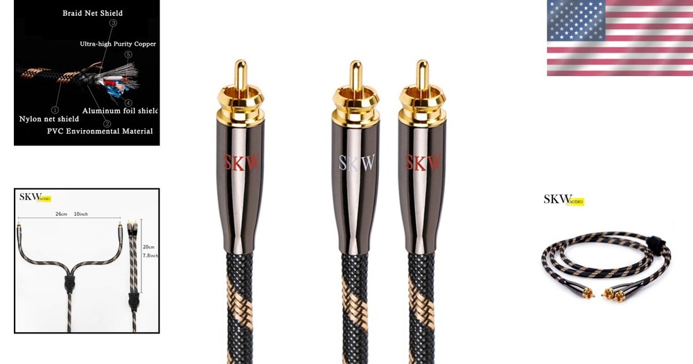 Gauge: 22 AWG Features: Gold Plated, Multiple Shield, Braided, Durable, High Purity Copper, Shielded UPC: Does not apply Size: 6.5ft (2 M) Compatible Devices: Male Color: Black Special Feature: Braided Brand: Unbranded Compatible Model: Universal Connector A: RCA Male Connector B: RCA Male Connection Split/Duplication: 1:2 Connector Type: Rca Charger Included: No gtin13: Does not apply Cable Type: Composite Package Dimensions: 10.04 X 9.09 X 1.14 Inches; 7.37 Ounces Type: Splitter Cable