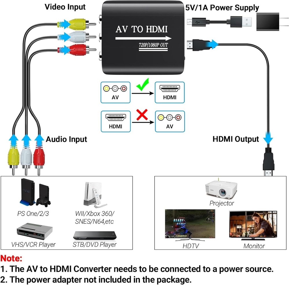 RCA to HDMI Converter 1080P AV Adapter for TV/PC/PS3/Xbox/Wii/VHS/DVD with Cable Description: RCA to HDMI Converter: Converts analog RCA composite (Yellow, White, Red) input to HDMI 720P/1080P (60HZ) output, displayed on smart TV, projector and HDTV monitor. Making video come alive, giving the most realistic HD visual experience. Important Note: RCA inputs for HDMI output only! Easy to Use : GINGIN Mini RCA to HDMI Adapter need no extra driver, portable, flexible, just plug and play. Please hook up the USB power cable (included) to 5V 1A power adapter during use. Widely Used: This AV to HDMI Adapter is widely applied to PS1, PS2, PS3, Xbox, N64, WII, STB, VHS, VCR, DVD Players and other devices with standard composite AV input. Broad Compatibility : This Audio Video to HDMI Converter supports source formats of PAL, NTSC3.58, NTSC4.43, SECAM, PAL/M, PAL/N standard TV. Provide advanced signal processing with great precision, colors, resolutions, and details. Package&After-sales Service: Package Include: 1*CVBS to HDMI Converter, 1*USB Power Cable(2.6ft/0.8m), 1*HDMI Cable(3.3ft/1m), 1*Male RCA Cables(3.3ft/1m), 1*User Manual. We provide 18 months after-sales service and 30 days no hesitate money back.