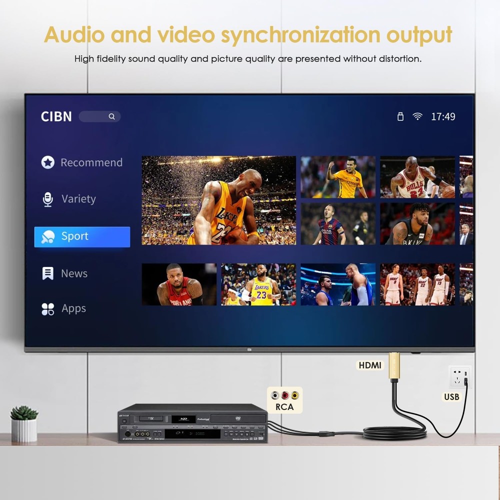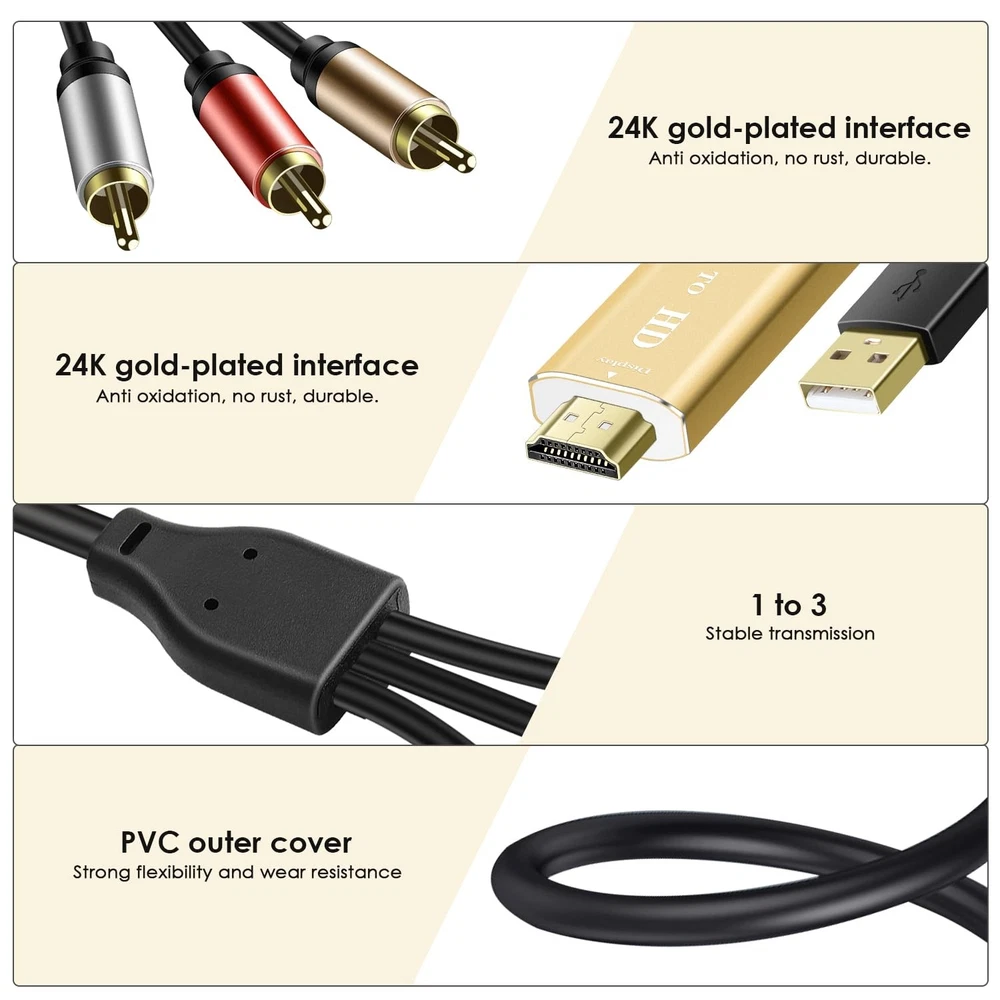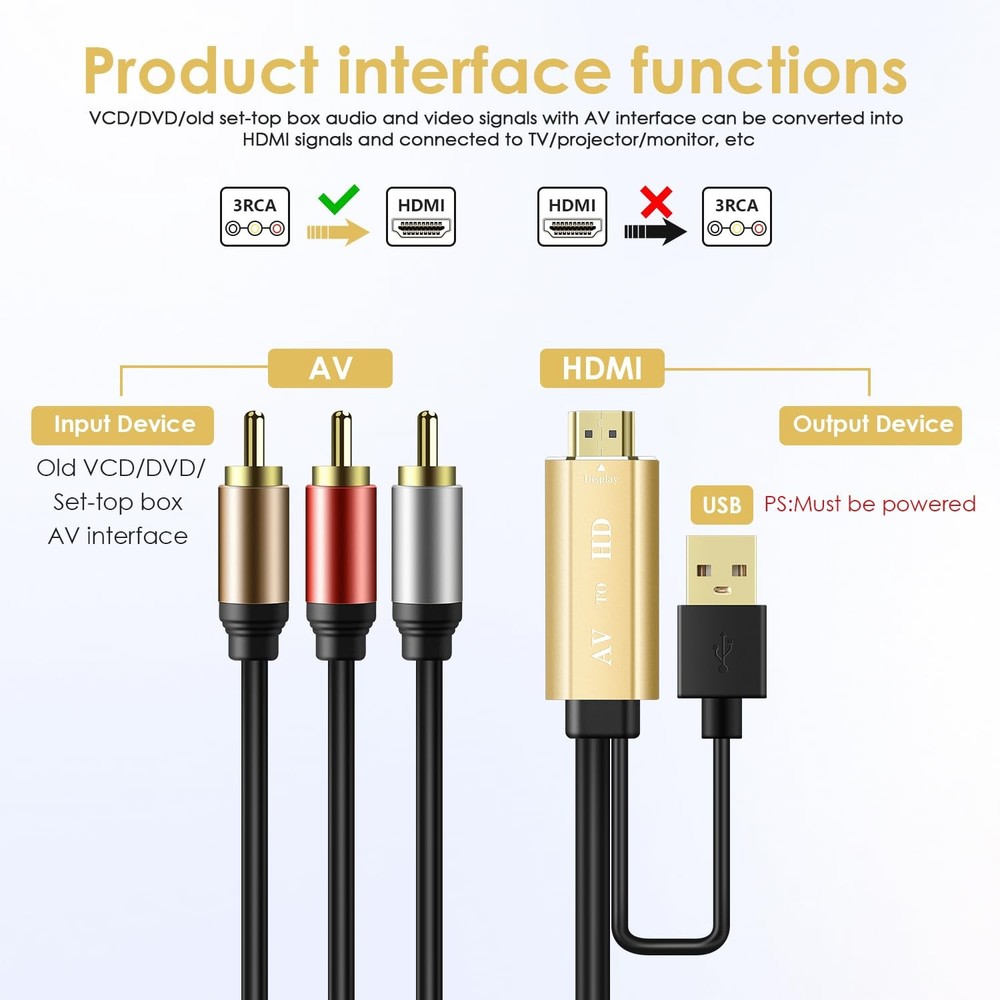 If you want to use your DVD, VCR, VHS, Android TV box, or game system with RCA output to connect to your new HDTV or HDMI, this RCA to HDMI converter is what you need. RCA to HDMI Converter Kit: Contain all necessary cables you need, such as Male RCA cable, HDMI cable, micro USB Power cable and built-in intelligent chip, no need to buy extra cable, more convenient to use. Features: Converter RCA signals into HDMI signals so you can watch your video on your HD Smart TV. No need to buy extra RCA cable and HDMI cable. No driver need,just plug and play. Helped to play your video consoles with your newer TV,then you got back to live your memories again. Allows you to view your favorite VHS tapes and preserve memories. It can bring back your family memories, relive your childhood in seconds, and it’s also a ideal choice for those who still love playing older game systems. Makes it easy to get old tech to work with new tech without a whole lot of fuss and costs. Note: This converter is not bidirectional. Just a one-way connector only, convert signal from RCA to HDMI. It can not convert HDMI to RCA. Connect old AV devices to modern HDMI-equipped TV: This RCA to HDMI converter can convert analog RCA composite input to HDMI up to1080P output. Great for using older video players with smart TV, easily connected old-school VHS/DVD/VCR player to smart TV, you can watch old equipment sources and use old game systems on new TV that may not have RCA, which can bring back your childhood memories. Perfect for making old video peripherals useful again. All in one AV to HDMI Cable Adapter: Supplied with RCA male cable, HDMI cable, and USB power cable, features a built in RCA to HDMI converter chipset, no need to buy extra cable, Hassle Free and Save you money by eliminating the need for extra components. Great For Viewing VHS and DVDs from old analog Player to New Digital TV. Easy HDMI hook up for older AV devices: Easy to use, no need any drivers, just plug to play, Please remember to hook up the USB power cable to 5V power source to make it work, you can get it to work within minutes. Note: the Audio Video cable to HDMI Converter only support converts AV to HDMI, can't converts HDMI to AV. 1080P HDMI Quality Supported: The av to hdmi converter has an built in authentic HD chip that supports advanced signal processing with great precision, colors, resolutions scale up to 1080P HDMI. Wide Compatibility: This composite to hdmi adapter is widely applied to use your old DVD, VCR, VHS, Android TV box, PS2, PS3 or game system with RCA input to connect to your new HDTV or HDMI only monitor, this RCA to HDMI converter is the right choice.