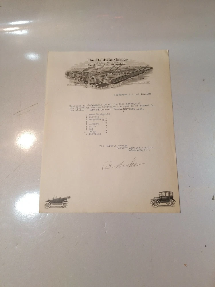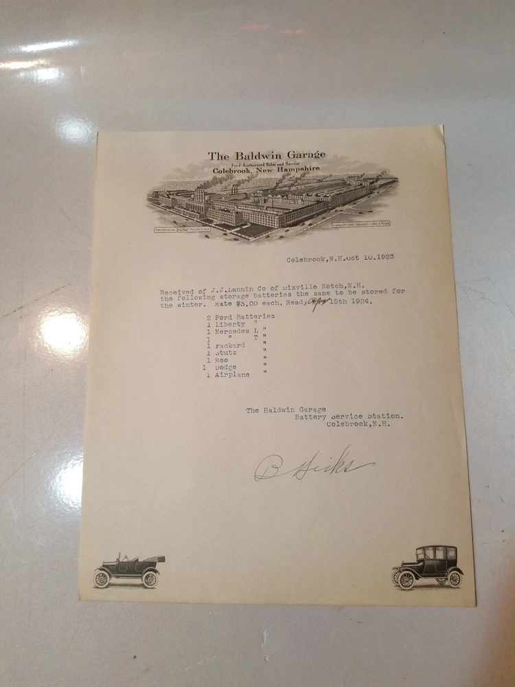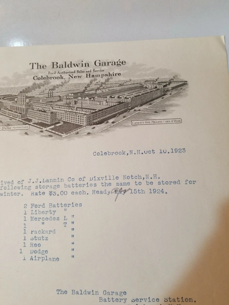 READ!! 1923 letterhead THE BALSAMS DIXVILLE NOTCH - BALDWIN GARAGE COLEBROOK NH . Shipped with USPS First Class Package. This is a letter/bill for battery storage for the vehicles owned by the Balsams. Interesting enough is the battery for an airplane. The Balsams at one time had a small fleet of planes that flew in from NY. I have actually seen the photos. Nice piece of history. Lannin co. Owned the Balsams.