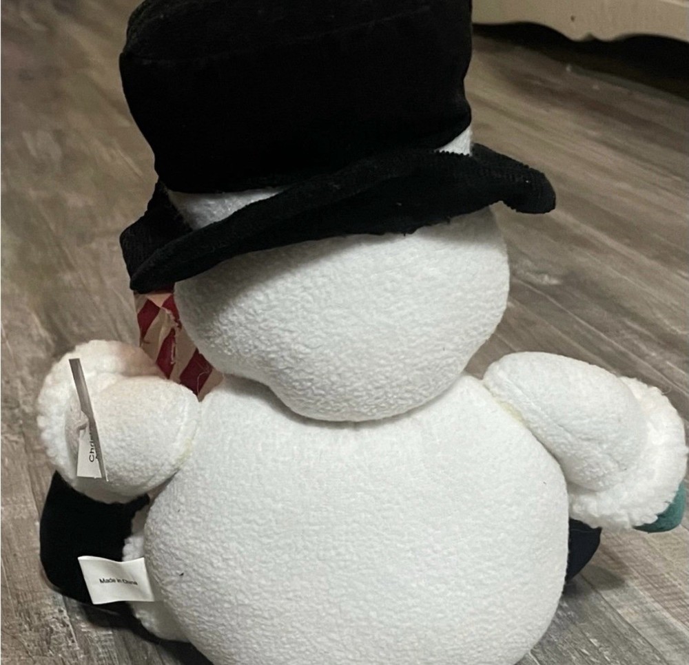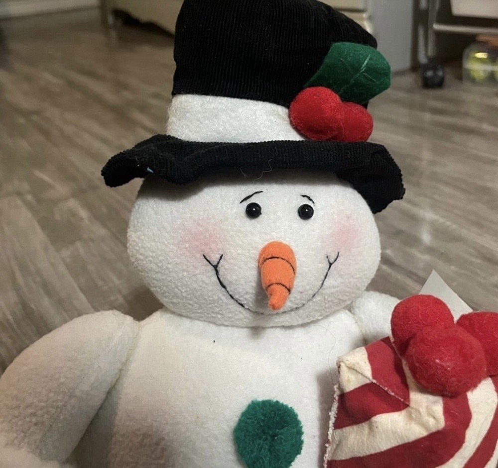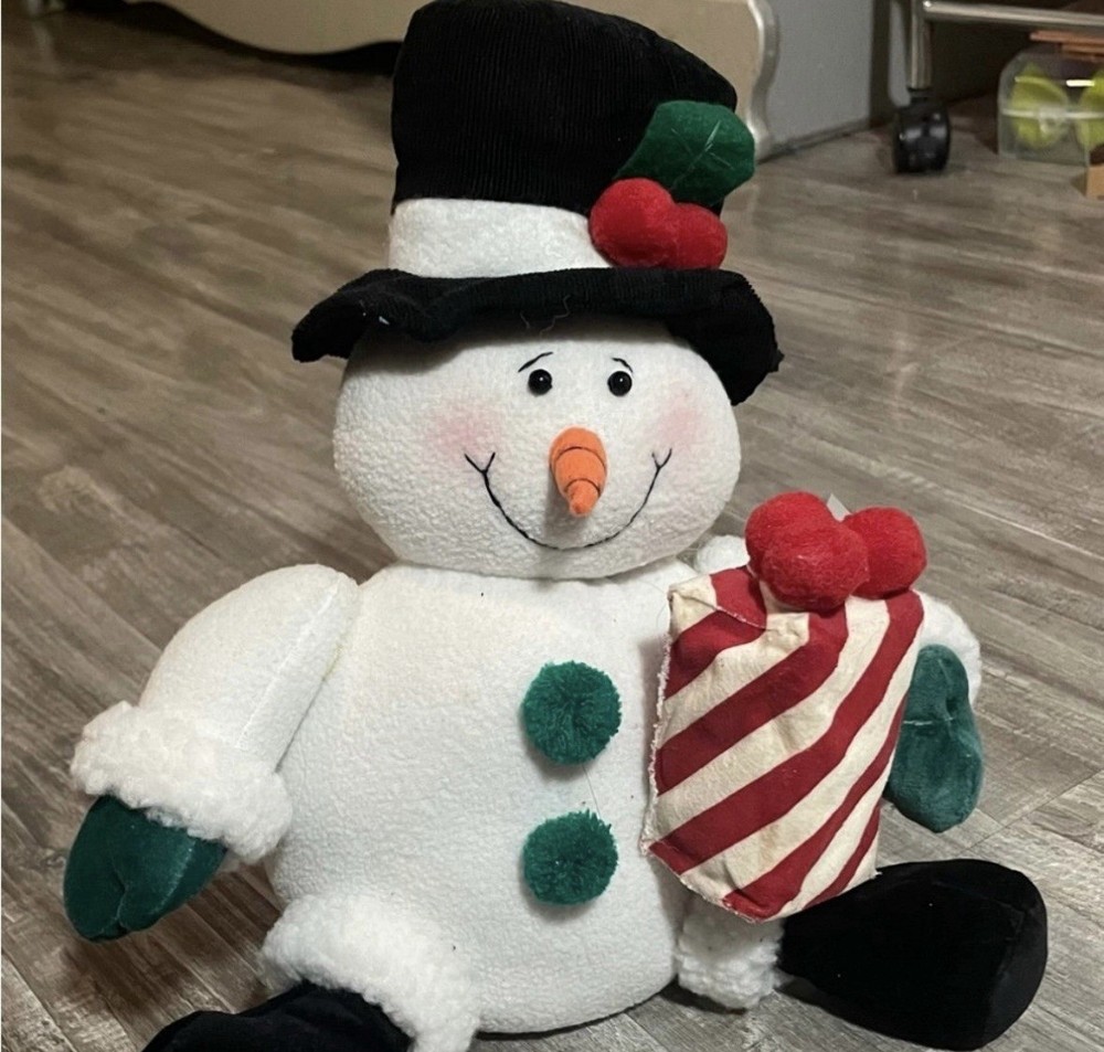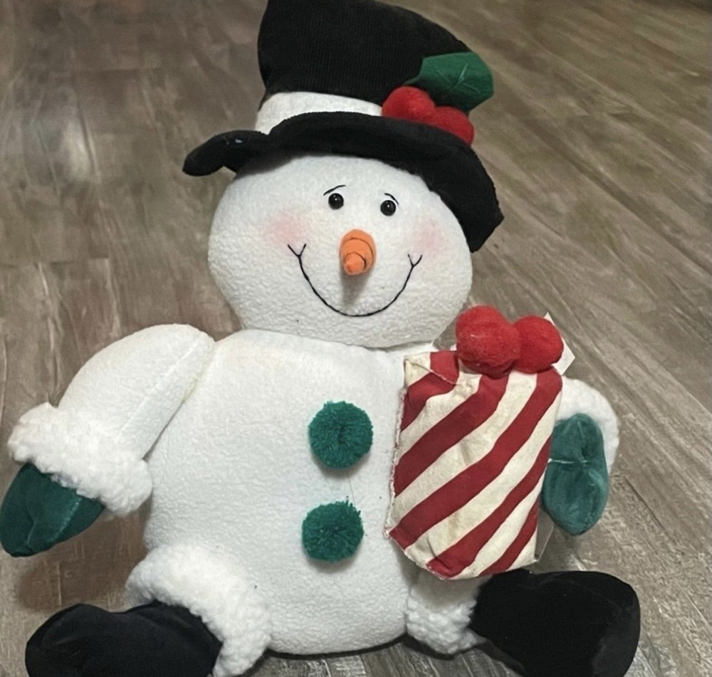 Vintage Christmas Snowman with present , home decor bean bag plushie in good condition was used for decor Comment any questions and offers are welcome! Want me to upload specific pictures of the item just ask :) Smoke free and pet free home same day shipping !