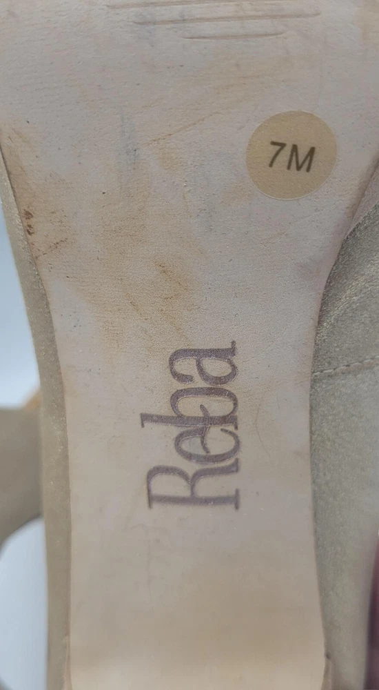 Toe Shape:Peep ToeSeller Notes:“Heels are in GREAT used condition”Upper Material:LeatherStyle:PlatformUS Shoe Size:7MColor:GoldBrand:RebaType:HeelDepartment:Women