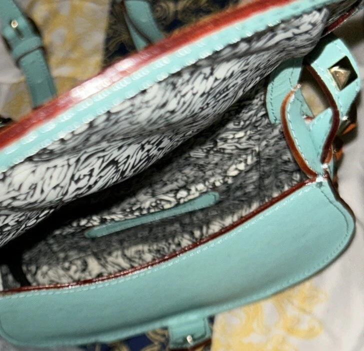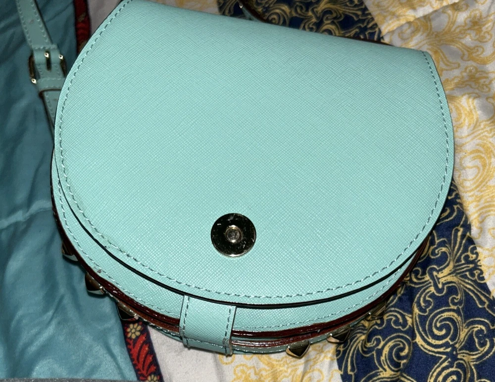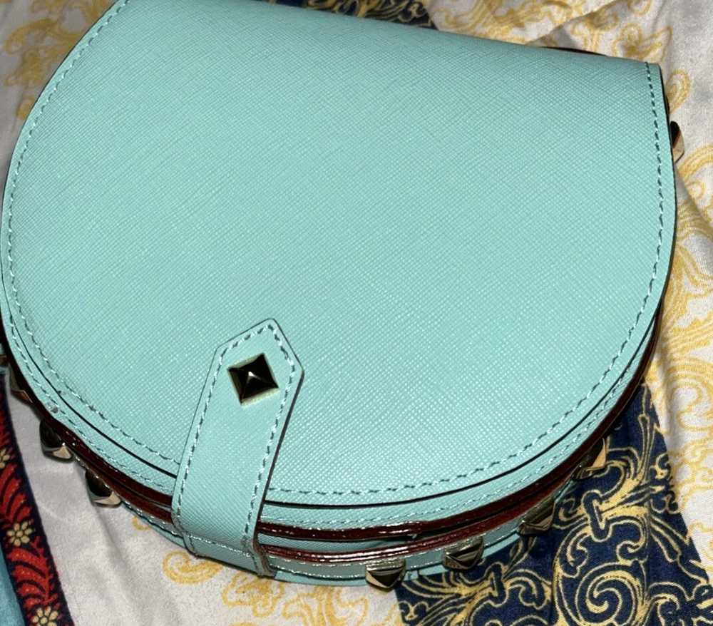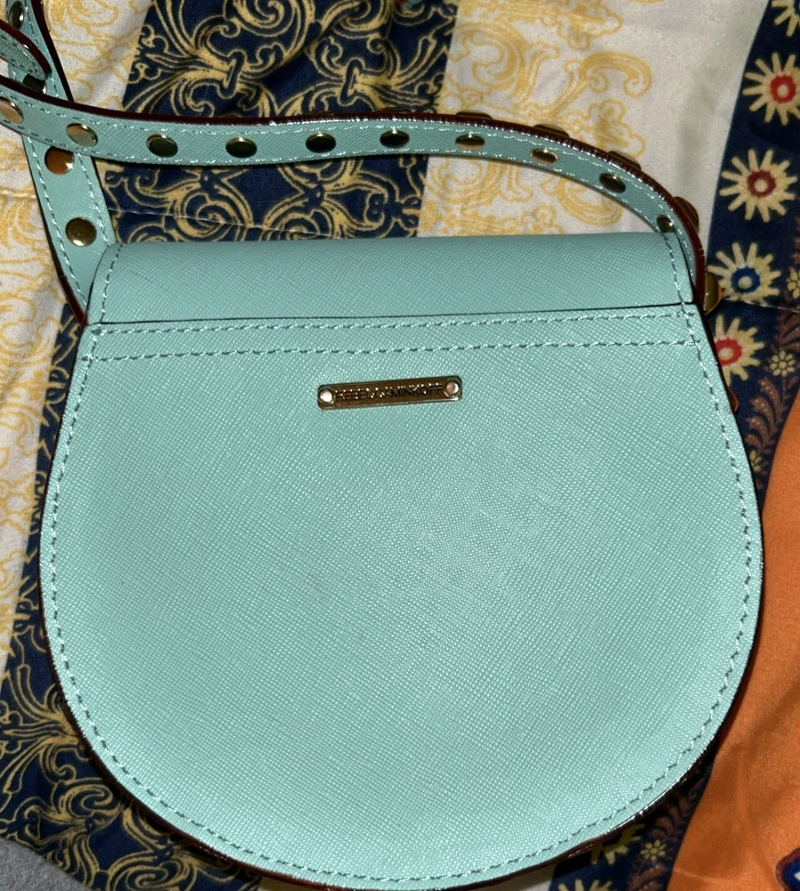 {{{{This purse has a few light tiny stains so it may need a good wipe-down but other than that it’s in pristine condition!! }}} Elevate your style with this beautiful Rebecca Minkoff Skylar Cross Body Handbag. The bag features a stunning turquoise exterior and a gold hardware color that adds a touch of elegance to your outfit. It has a magnetic snap closure that keeps your belongings secure and a laser cut in front, smooth finish in back that gives it a unique and modern look. The bag has a small size, measuring 4 inches in height and 7 inches in length, making it perfect for a day out or a night on the town. It has a detachable strap that allows you to carry it comfortably and an adjustable strap with a drop of 28 inches. The bag is made of high-quality leather and has a tan design lining material that complements the overall look of the bag. This Rebecca Minkoff Skylar Cross Body Handbag is a must-have for any fashion-forward woman.