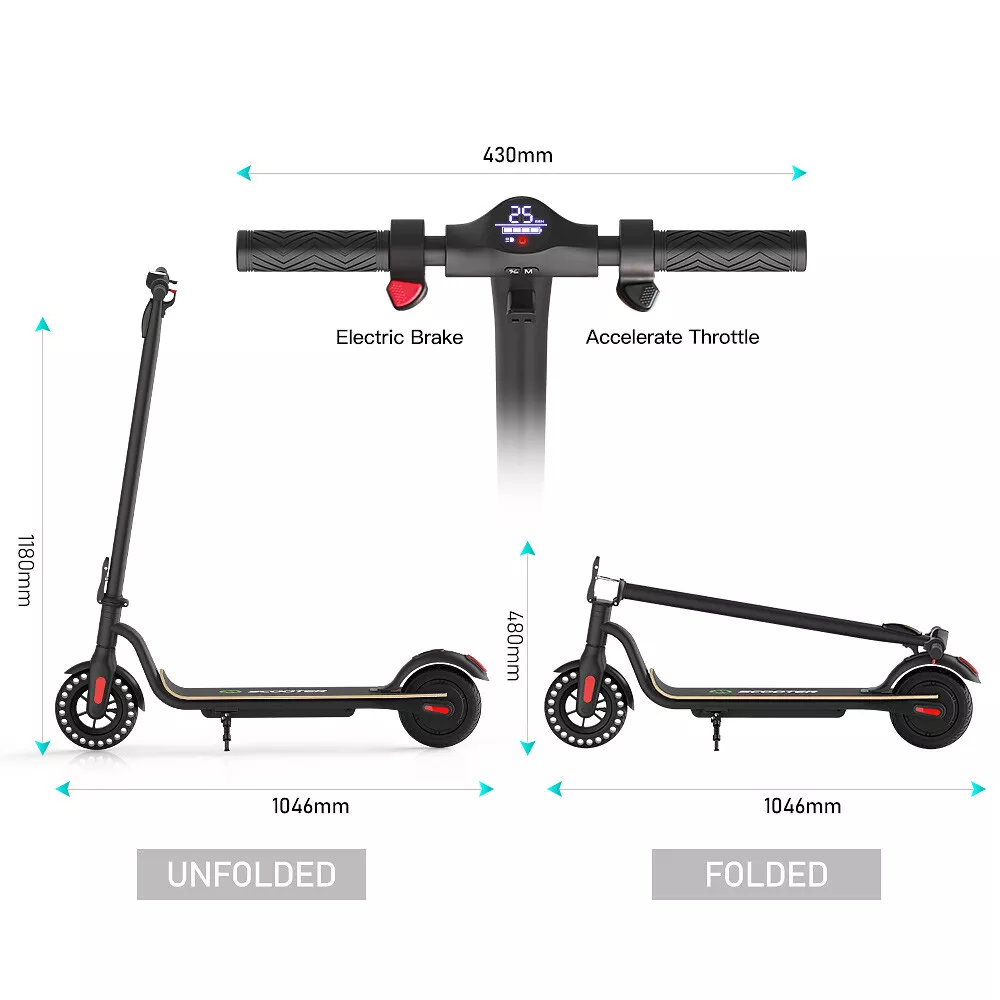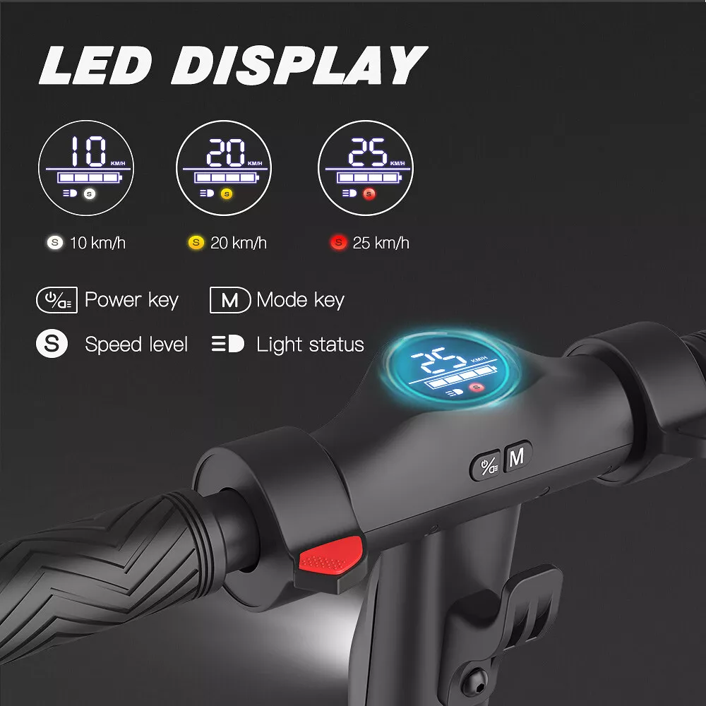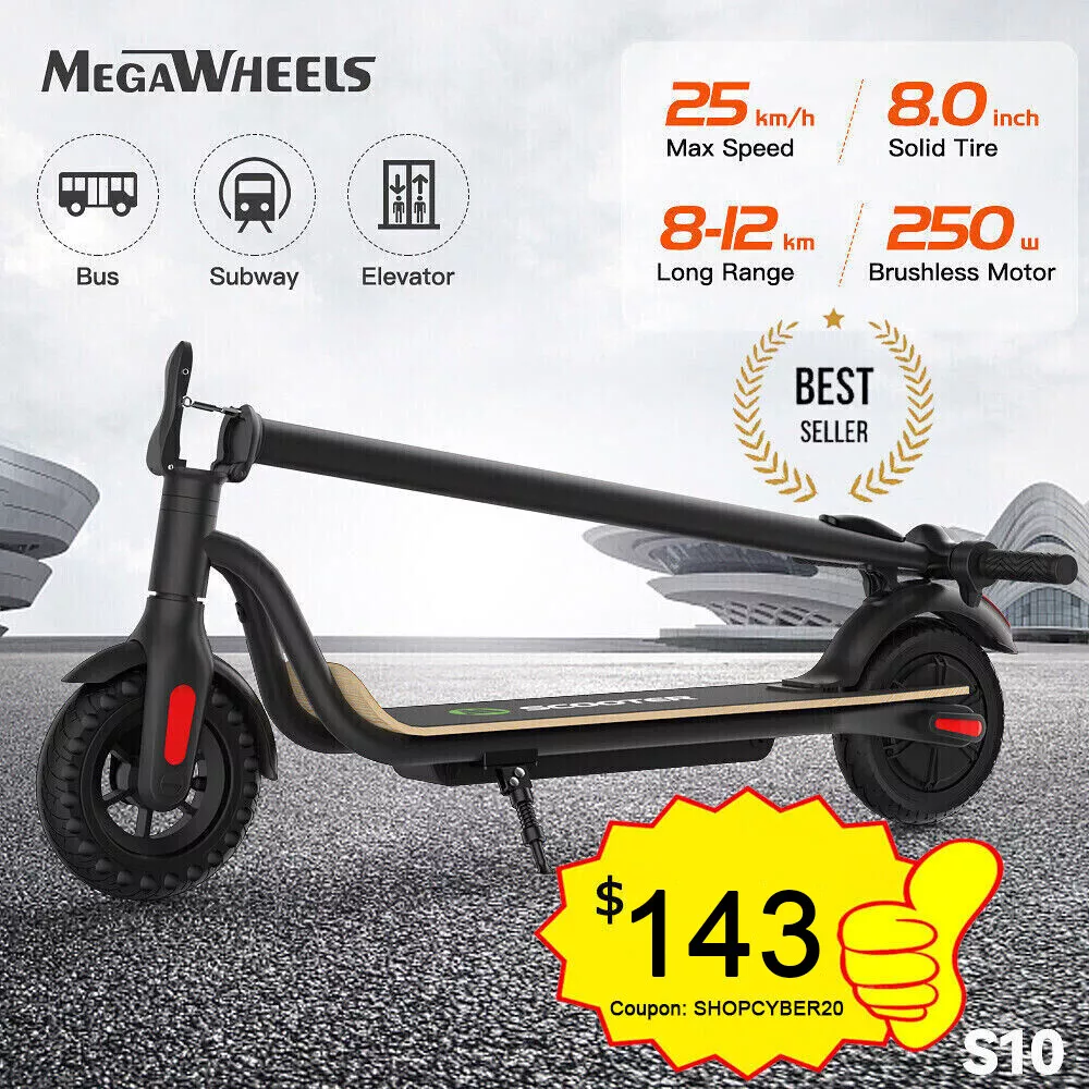 Features: 【 Anti-puncture solid tires 】The electric scooter uses 8.0-inch honeycomb shock-absorbing tires with high elasticity and wear resistance. The honeycomb tire does not require inflation, repair, maintenance.And it's don't worry about punctures.It also has a good anti-slip effect. 【 5.2 AH large capacity battery and more battery life 】Fitted with 5.2 Ah lithium-ion battery, the scooter can provide long full mileage 8-12km, up to 12km range.Full charged for only 4-5 hours, will hold climbing ability 20 degrees. 【 Three gears with headlight & rearlight 】Three gears (6.25MPH=10KM/H, 12.5MPH=20KM/H, 15.5MPH=25KM/H), easy to change through a button on the LED display which also shows the battery and the gear clearly. The low-speed gear prevents teenagers or children from driving too fast. LED Headlight and rearlight double insure your safety at night. 【 High level security 】This S10 electric scooter applies dual brake system (a motor electronic brake on the handlebar and a foot friction rear brake on the back wheel) with CE/UL/FCC/RoHS safety certification. The pedal is made of Malleable Maple Wooden, which is more durable. You can easily cross all kinds of roads, reduce bumps and keep you feel comfortable. 【 None-0 start 】The electric scooter applies a none-0 start for the safety consideration, please scroll for a distance to start. Features a bigger and longer deck, a double braking system, a long-range battery, and a One-step portable folding mechanism, the Megawheels electric scooters can bring a smooth and comfortable riding into your way.We provide professional technology support. Any question, just contact us, we will reply in 24 hours with satisfying solutions. 【 Delivery time and Service 】We have warehouses in the US, scooters can be delivered in 3-7 days. If you have any questions about the scooter, please feel free to contact us, we will help you in 24 hours. Specification: Brand: Megawheels Model: S10 Dimension: Unfolding 105 x 43 x 118 cm; Folding: 105 x 43 x 48 cm Net Weight: 11.9kg Color: Black Frame Material: Aluminium Tires: 8.0" Honeycomb Front Tire & Solid Rear Tire Max Load: 100kg Max speed: approx.25KM/h Speed level: Gear 1--Max 10km/h ; Gear 2--Max 20km/h; Gear 3--Max 25km/h Mileage: approx. 8-12km Grade Ability: 20 degree slope Working Temperature: -15°C-50°C Storage Temperature: -20°C-25°C Mode Type of Motor: Brushless hub motor Battery Type: High quality lithium battery Battery Capacitiy: 5.2Ah Battery Voltage: 36V Charger Input Voltage: 100V-240V Charger Frequent: 50Hz/60Hz Charging time: approx. 4 hours Package Contents: 1 * Electric Scooter 1 * Battery Charger 1 * User's Manual NOTE:The appearance of the product you receive may vary slightly from the image shown due to differing production batches! LCD Dashboard Long Battery life 8.0'' Anti-puncture Tires Three speeds (10km/h, 20km/h, 25km/h), easily changed via buttons on the LED display, also clearly showing remaining battery and headlight status. With a battery capacity of 5200mAh, this adult electric scooter has a lifespan of up to 8-12km (depending on road conditions and rider's weight), and the charging time is 4-5 hours. Honeycomb tires can prevent tire blowouts. You can drive freely on any road. You don't have to worry about tire blowouts,it can avoid trouble during driving. 250W motor Install the handle Great scooter for a commute or school The S10 electric scooters motor has a power of up to 250 W, which accelerates to 25 km/h in seconds. The powerful motor helps you to overcome small inclines of city streets easily. Note: The left and right hand handles are installed in a counter-clockwise direction. You don't have to rush to the crowded bus or underground. 11.9Kg-Easy to carry None-0 start This upgraded version of the S10 front wheel needs to be installed by yourself. Lightweight and easy to carry. Reduce the risk of scooter theft The electric scooter applies a none-0 start for the safety consideration, please scroll for a distance to start. The installation steps are very simple, if you can't install it, we will guide you to install the front wheel. Riding Skills: -Put your foot in the front of the scooter and the other foot on the floor before riding. -Make sure that the riding route is smooth. -Slide forward with the food standing on the floor before starting (like riding the scooter without power). -Immediately press the acceleration button and lean forward to avoid falling over backward due to inertia, so that the electric scooter will enter the working status. -Avoid pressing the handle with your body in the acceleration and deceleration process. Put one foot ahead and the other behind (like on the sliding plate/surfboard, put one foot ahead and the other behind by 70-90 for better comfort). -Turning – The turning principle of the electric scooter is the same with that of surfboard/sliding plate/skis. The handle shall be balanced with the body. Observe and make sure that turning is safe before turning. Payment Delivery details Terms of sales About Us Contact us Payment 1. We accept Paypal Payment only. 2. All items will be shipped to buyer's ebay address. Before you pay, please make sure your address in ebay matches the address you would like us to ship to.(Please make sure that the street portion of the address does not exceed 35 characters) Please NOTE that orders placed on weekends or public holidays will be sent out on the next working day. Delivery time may be delayed during weekends and holidays. Delivery details 1. How much is shipping and handling (S&H)? The S&H costs will be clearly marked on the auction item page. 2. Please make sure the Ship-To address you type during checkout is correct. We are not responsible for any wrong or undeliverable addresses. 3. Local pick up is not available. 4. Items are generally shipped out the next business day after your payment has been cleared (Sat. & Sun. excluded). 5. The tracking number will be uploaded upon item