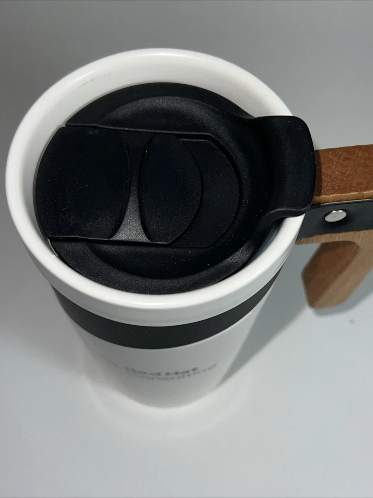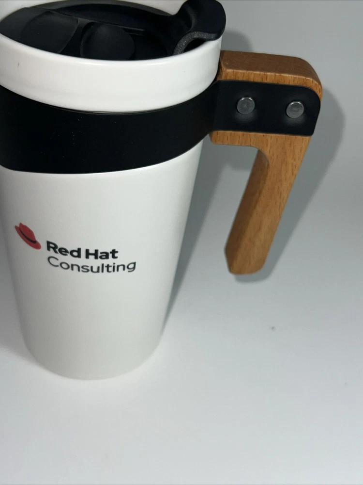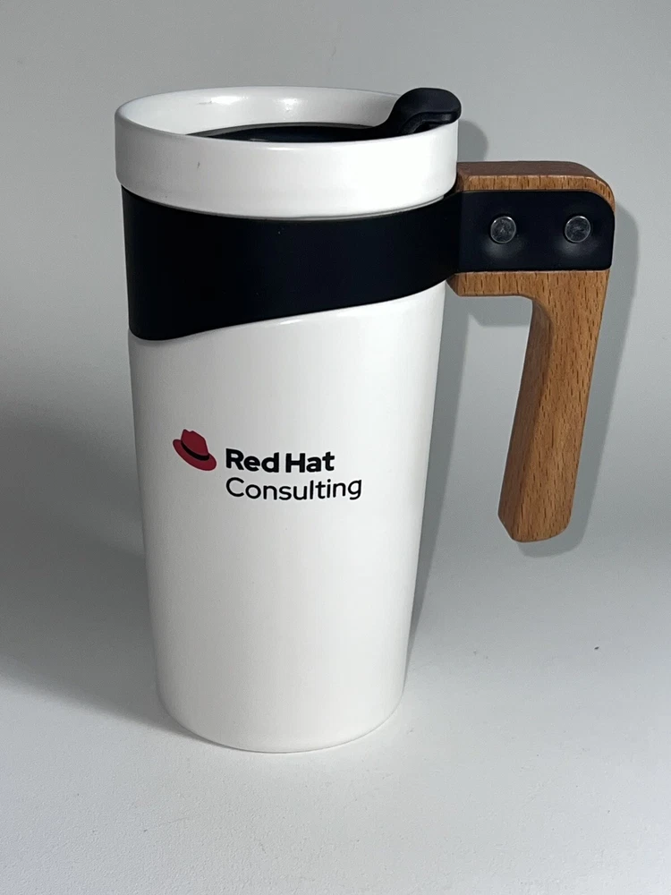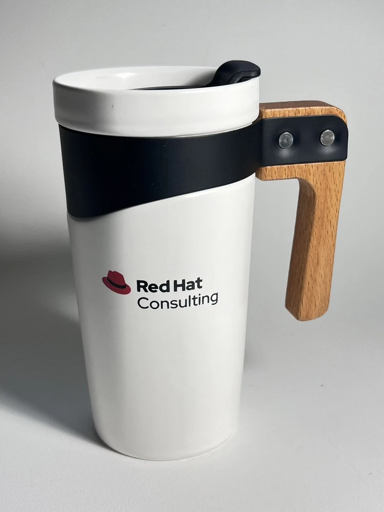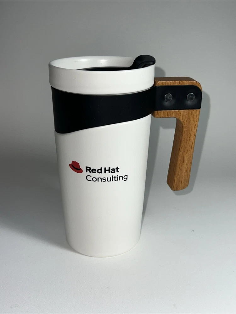 Enjoy your favorite hot or cold beverage on-the-go with this RED Hat Consulting travel mug. The wooden handle and ceramic material make this coffee mug a perfect addition to your kitchen storage and organization. With a capacity of 16 oz and a height of 6.5 inches, this mug is perfect for your daily commute or outdoor adventures. The white and brown lid design adds a touch of elegance to this travel mug, making it a great gift for any coffee or tea lover.