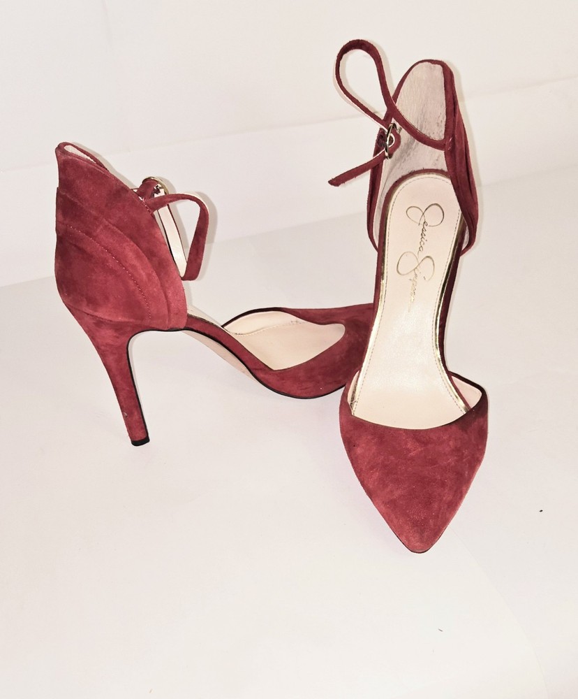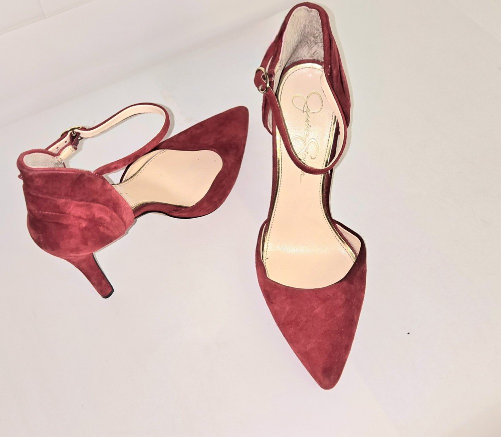 The RED SUEDE STRAPPY HEELS BY JESSICA SIMPSON in size 10 are a stylish and formal shoe option for women looking to make a statement. With a high heel height of 3-3.9 inches, these strappy heels feature an ankle strap for added comfort and support. Made with red suede material, these shoes are perfect for formal occasions and can add a pop of color to any outfit. The Jessica Simpson brand is known for quality and style, making these heels a fashionable choice for those looking to elevate their footwear collection.