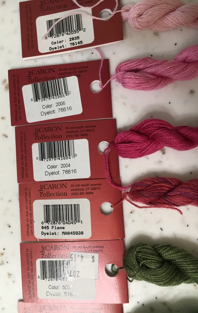 This is a fund raising auction for my embroidery chapter. Included are: 10 new skeins...045-Flame, 065-Emerald, 066-Jade,n 2004, 2006, 2035, 5002, 5060, 5121, 5123 Caron Impressions is a 50% wool, 50% silk blend. This set consists of solid colors which coordinate with Soie Cristale silk. It is about the same weight as Wildflowers, but has more loft. It is very versatile and can be used on fine linens as well as larger counts of needlepoint canvas. You can often control the look of your stitches to create either a sculptured or a satiny look simply by adding or subtracting one strand. The blend of wool and silk gives a unique appearance as the two fibers reflect light differently, giving your stitching great depth. 36 yards per skein. Retail is around $6/skein. My home is smoke free.