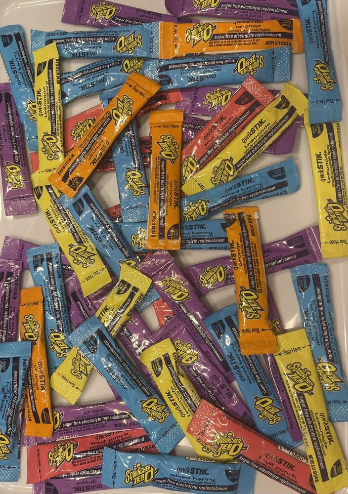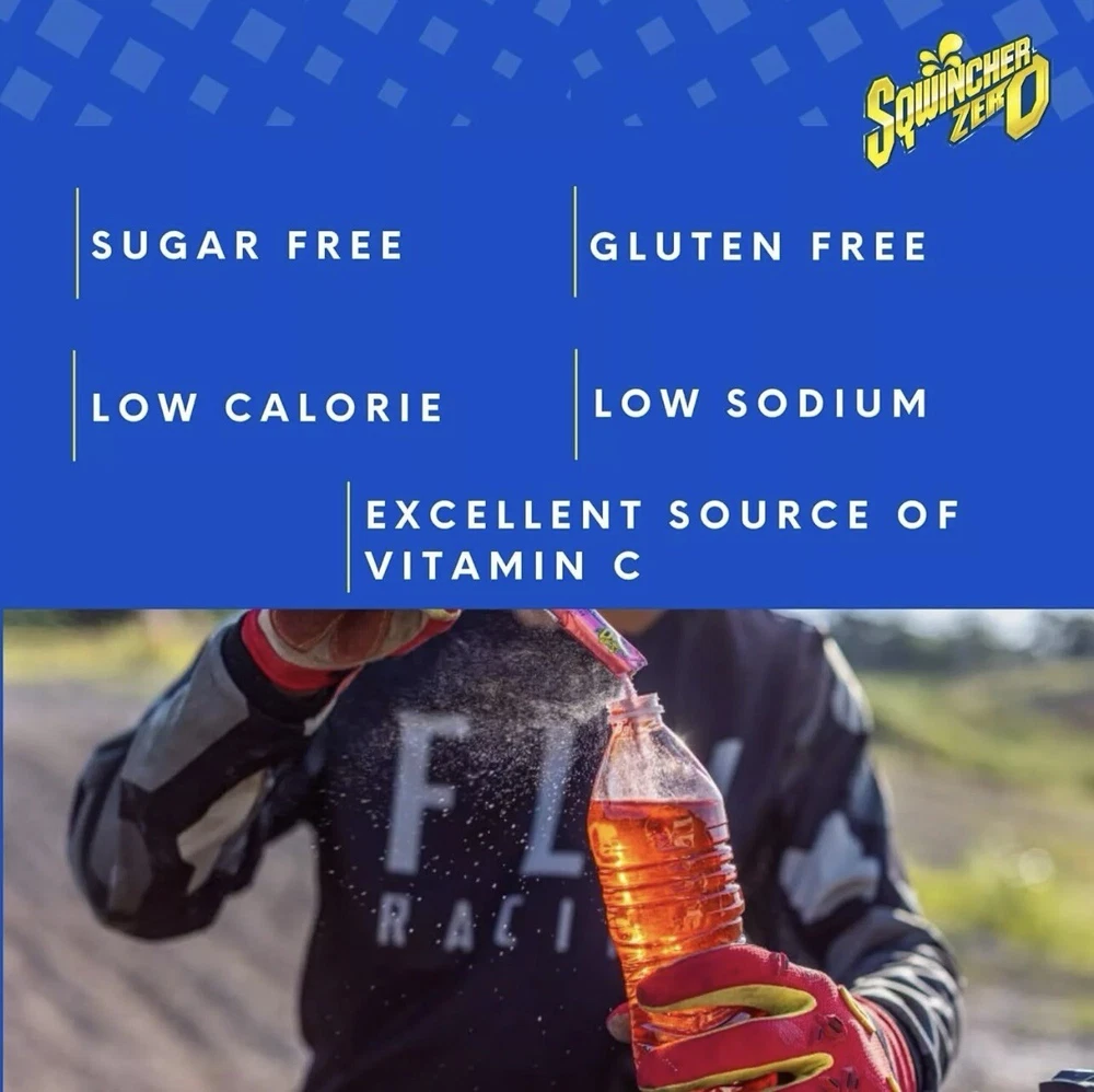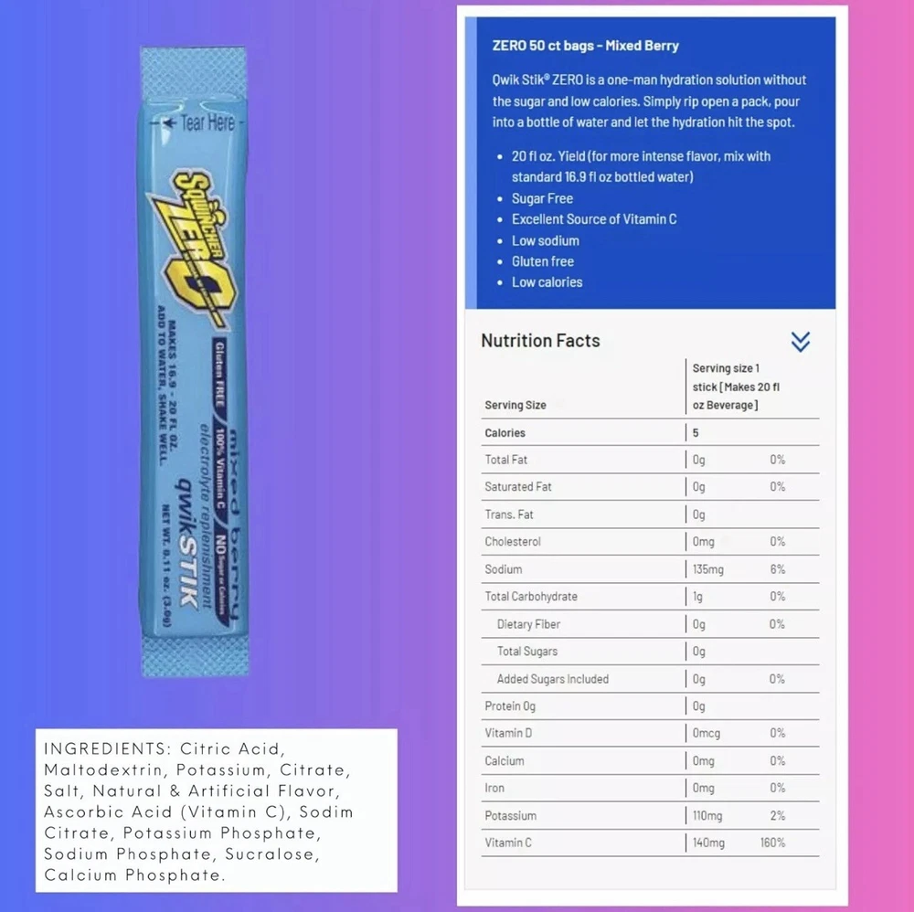 Sqwincher Qwik Stik - 5 Flavor Assorted Pack, 20 oz Yield ZERO Sugar Free Powder Mixes These packets are a quick & convenient method to replenish electrolytes and rehydrate. Add to 20 fl oz of water and enjoy a tasty, sugar free, low calorie, electrolyte beverage. QWIK STIK ZERO FEATURES: • 5 Flavor Assorted Pack (50 packets assorted) • Fruit Punch, Orange, Mixed Berry, Grape, Lemonade • Mix with 20 fl oz of water, or 16.9 fl oz for a more intense flavor • Hydration made easy - just pour into water, mix gently and enjoy • Convenient, on-the-go electrolyte replenishment • Gluten Free • Low Sodium • ZERO Sugar formulation • Low Calorie