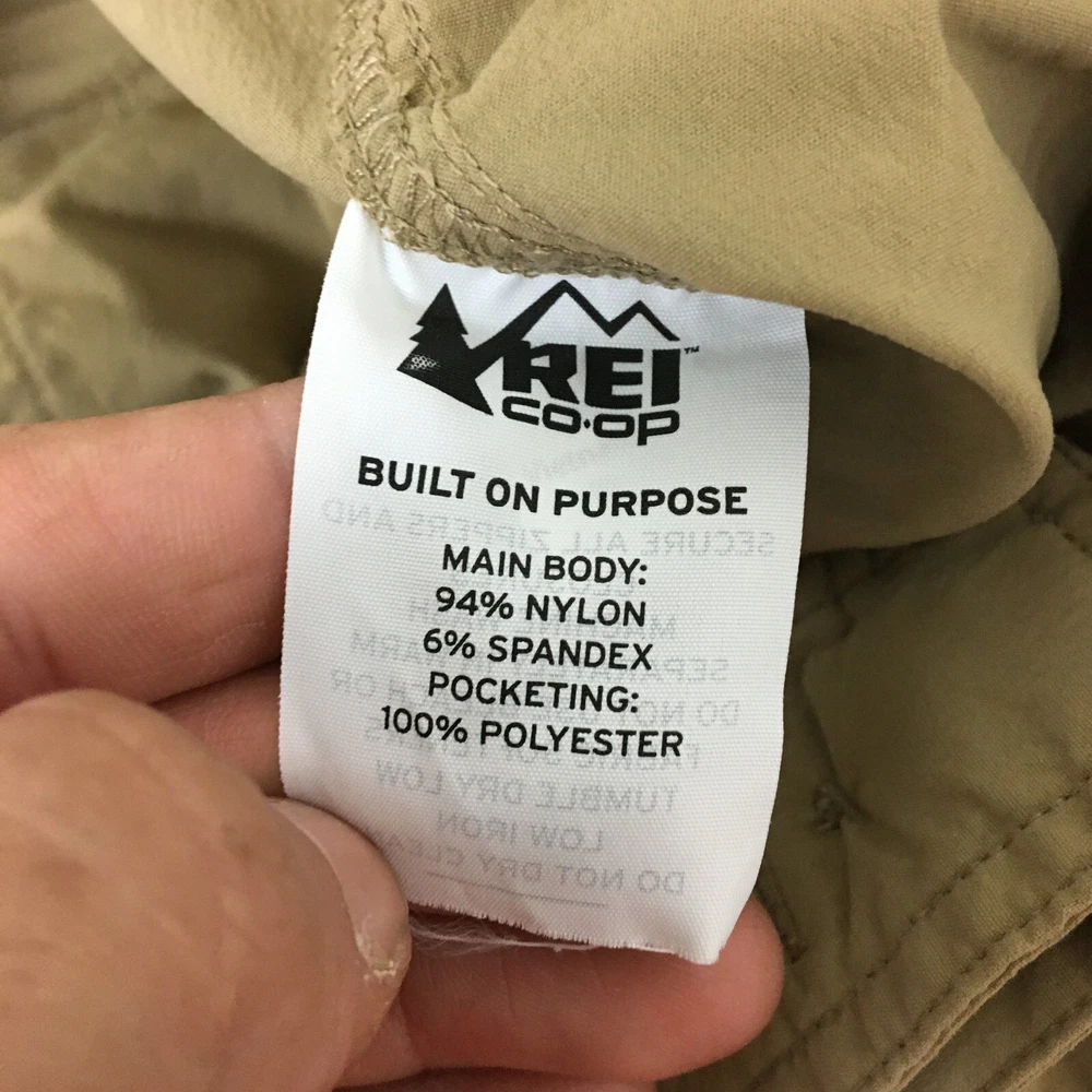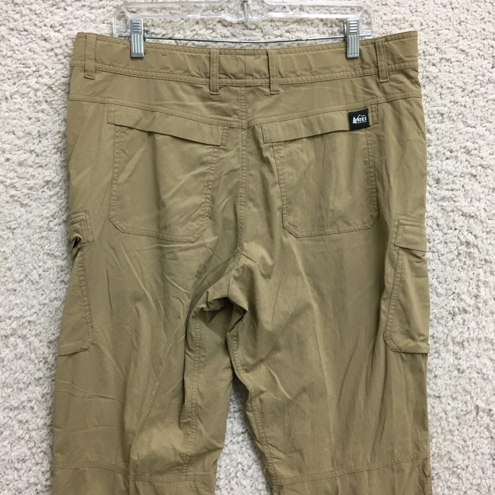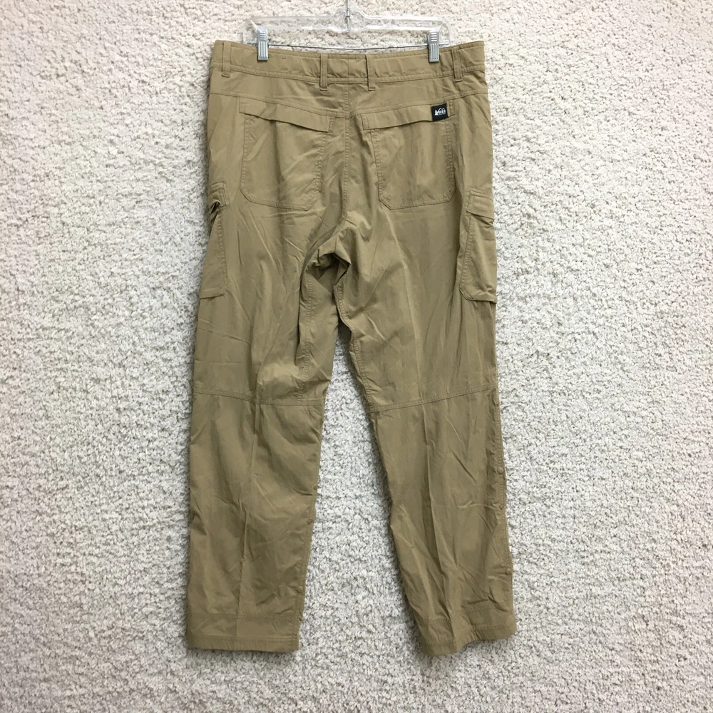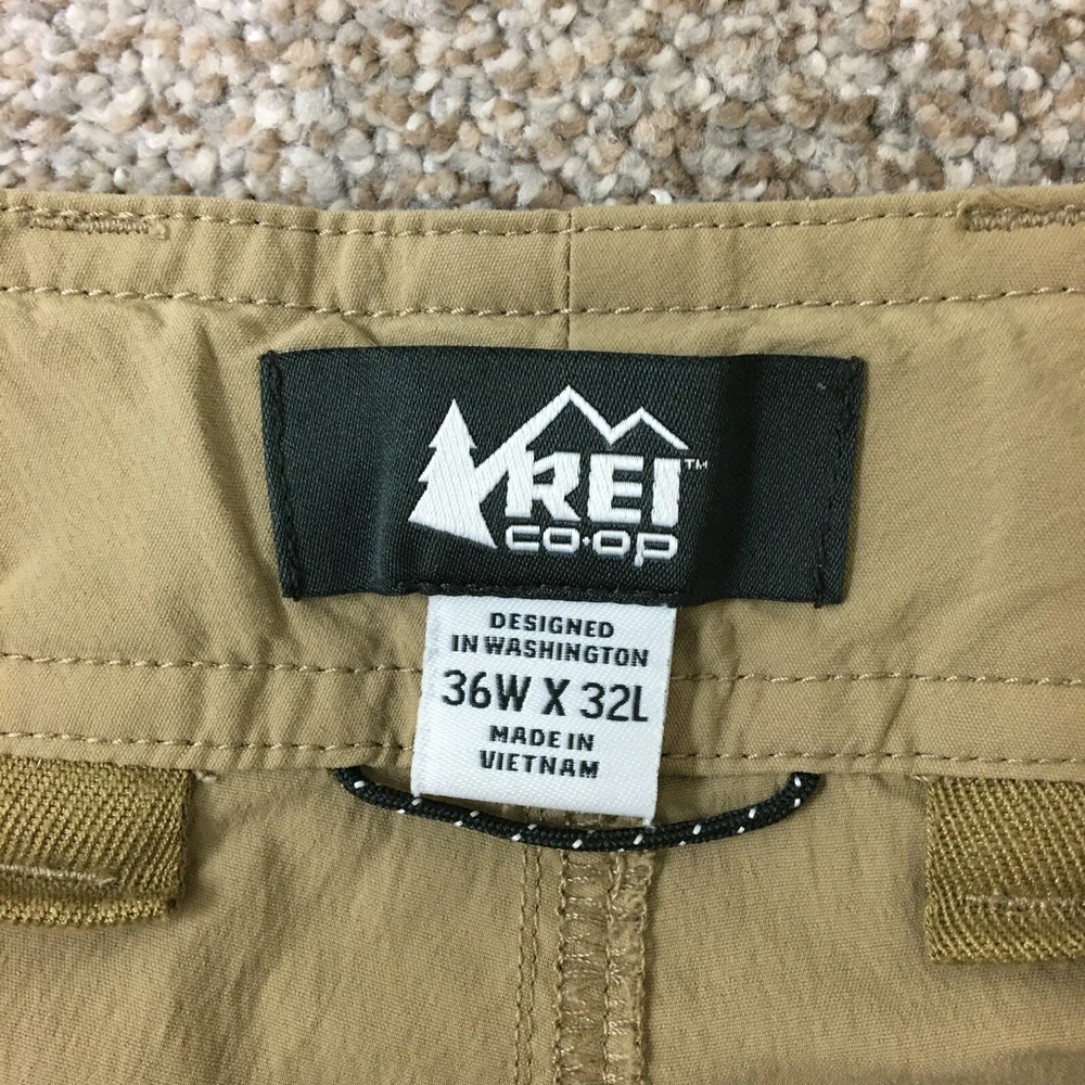 Closure: Button, Zip Waist Size: 36 Pocket Type: Slash Pocket Pattern: Solid Features: Belted, Breathable, Comfort, Easy Care, Lightweight, Pockets, Quick Dry Front Type: Flat Front Type: Pants Size: 36 Leg Style: Straight Department: Men Season: Fall, Spring, Summer Material: Nylon, Spandex Occasion: Casual, Travel, Workwear Garment Care: Machine Washable Color: Beige UPC: Does Not Apply Theme: American, Classic, Logo, Modern, Outdoor Fit: Relaxed gtin13: Does Not Apply Brand: REI Seller Notes: “Good Used Condition. Please, See Pictures for Full Condition and Measurements.” Size Type: Regular Rise: Mid (10-12 in) Accents: Button, Zipper Style: Cargo Country/Region of Manufacture: Vietnam Inseam: 32 in