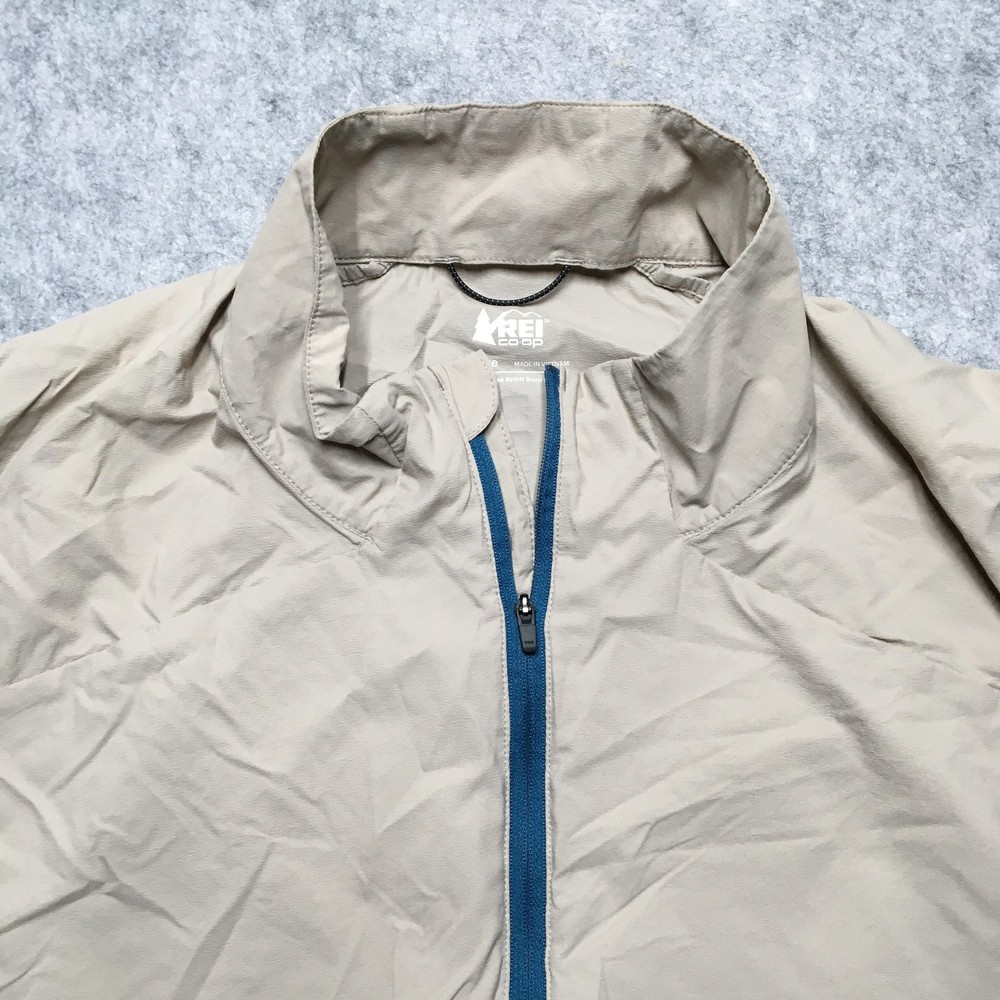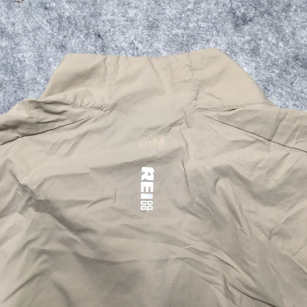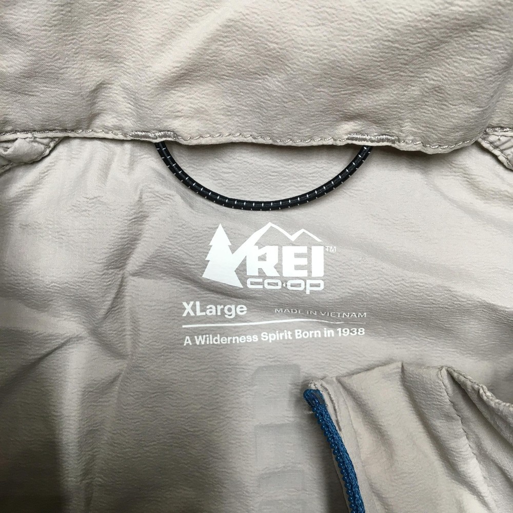 Brand: REI Co-op. Item: Mens lightweight windbreaker vest designed for hiking, walking, travel, and casual outdoor layering. Tag size: Mens XL (X Large) with a regular fit. Color: Solid beige body with contrasting blue front zipper and zipper pulls. Material: Shell/body 100% nylon (per interior fabric-content label). Features: Full-length front zipper, stand-up collar, two front zip hand pockets with corded zipper pulls, lightweight unlined nylon shell for wind-resistant layering, straight hem, and reflective details including REI Co-op back logo and a reflective strip near the lower back hem for added visibility. Branding and labels: Printed interior neck logo with REI co-op branding, XLarge size marking, MADE IN VIETNAM text, and A WILDERNESS SPIRIT BORN IN 1938 tagline; reflective REI co-op logo printed at the upper back; interior woven care and fabric-content label listing BODY: 100% NYLON and additional REI co-op branding; interior production tag with codes 22336-S21 and 186045. Country of origin: Made in Vietnam. Add a second (or more) item to your cart from my store to receive a discount on your order! [does not apply to orders made with Best Offer] (shown in cart) Shipping is a non-negotiable flat rate based on size and weight. Each additional item is only $2 more in shipping. Please message me with any questions. I accept free returns for any reason within 60 days of delivery date, including Does not fit and Just didn't like. Please note original shipping may be withheld in certain situations. Items are shipped from a smoke-free home and washed with Free & Clear detergent (except Dry Clean Only items). US Seller. Please message me with any questions! Items shipped within 1 business day (unless there is a vacation note).