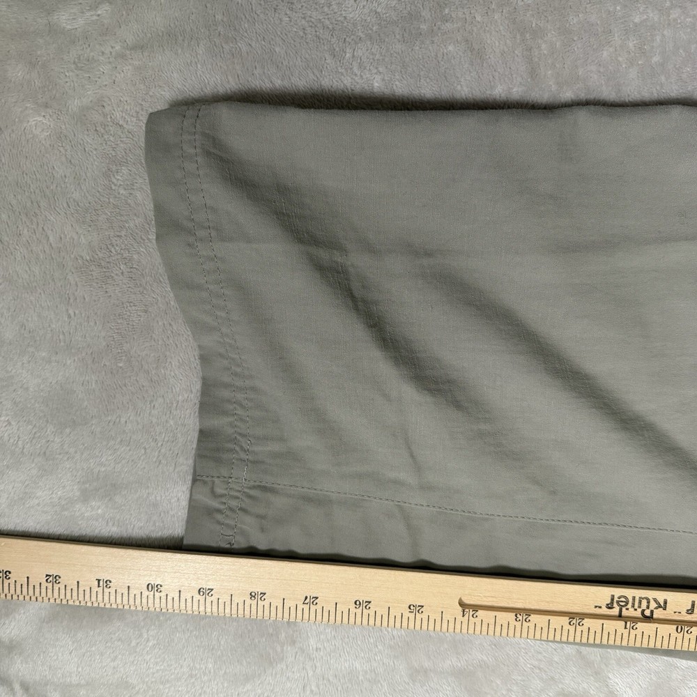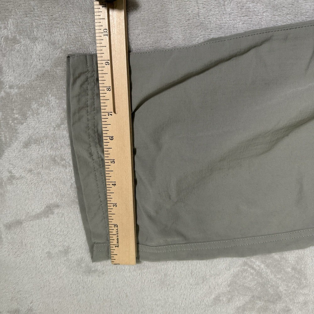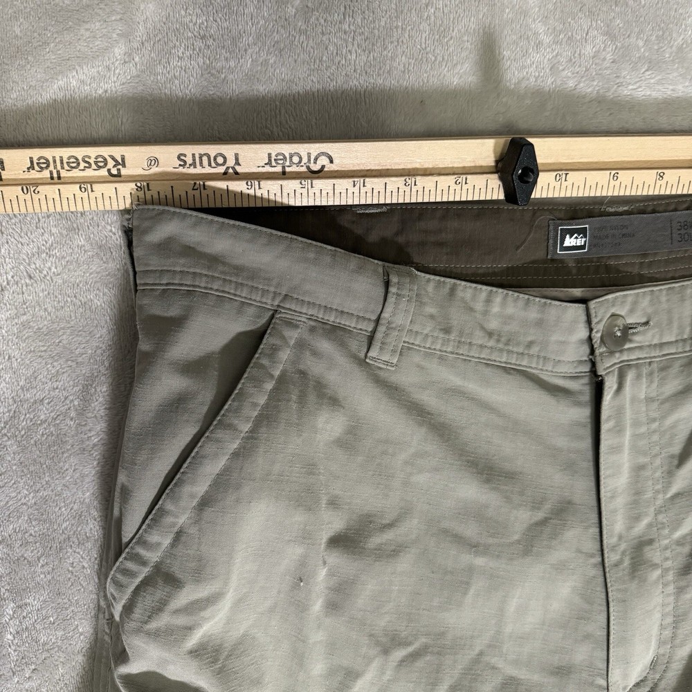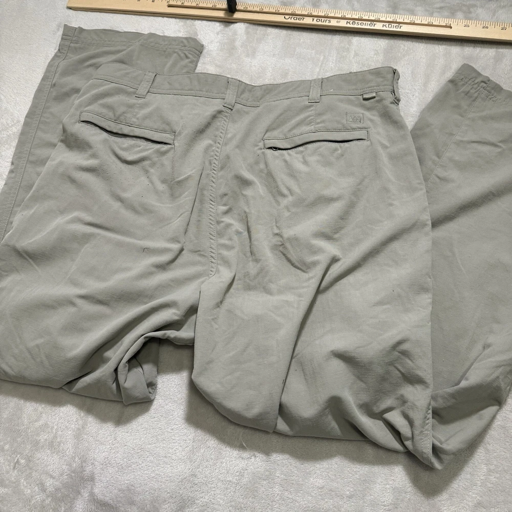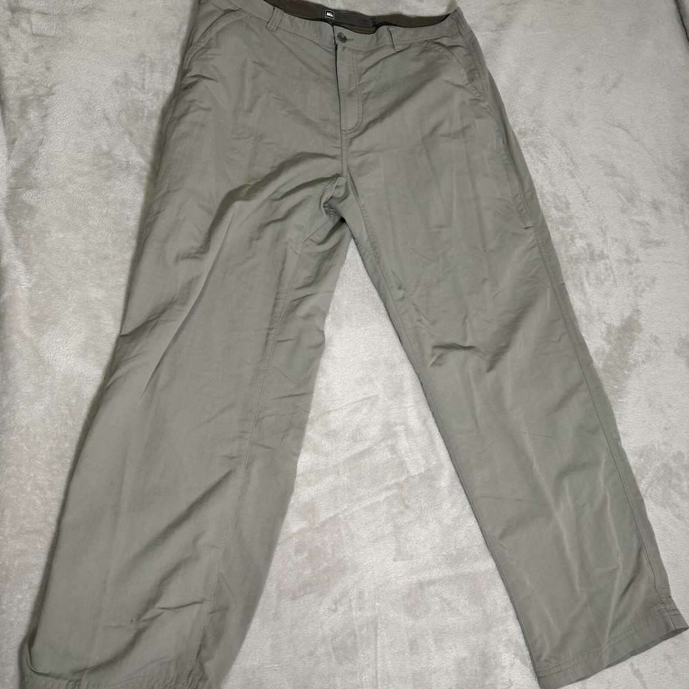 These REI pants for men are perfect for any occasion, whether you're hiking, camping, or just going about your day-to-day activities. They feature a high-rise waist and a straight leg style, with a flat front and cargo pockets. The pants are made of lightweight nylon fabric and have a beige color with a solid pattern. The pants come in a size 38 waist and 30 inseam, with a button closure and zipper accents. They also have the REI logo on the side, adding a touch of style to the design. These pants are machine washable and are part of the REI product line, ensuring their quality and durability. Get ready to hit the great outdoors with these stylish and functional pants!