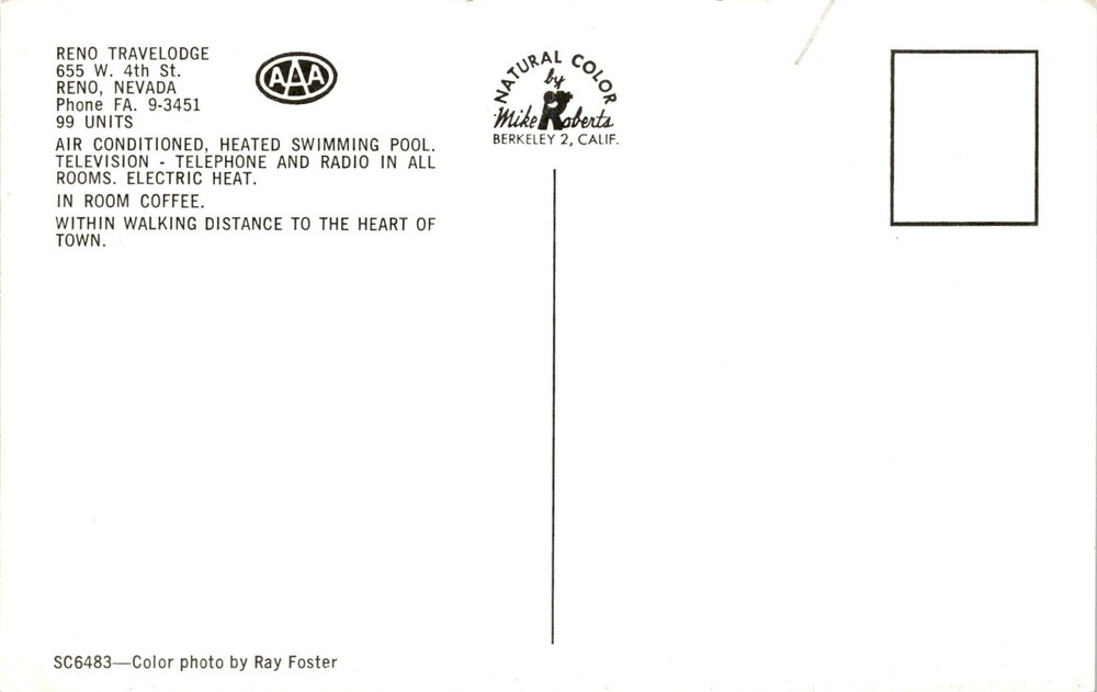 MAKE AN OFFER. THE MORE YOU BUY THE BETTER DEAL I WILL ACCEPT The postcard advertises the Reno Travelodge located at 655 W. 4th St. in Reno, Nevada. The Travelodge offers 99 units with amenities such as air conditioning, a heated swimming pool, television, telephone, radio, electric heat, in-room coffee, and is within walking distance to the heart of town.