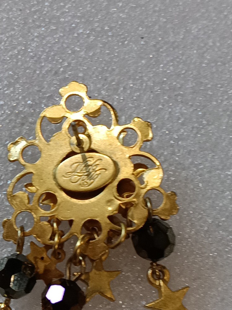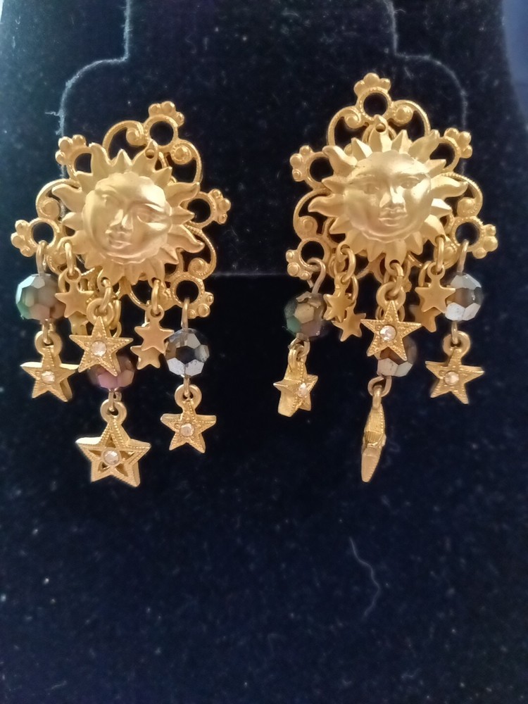 These beautiful earrings from Kirks Folly feature a stunning celestial design with dangling stars and brown breads. The leverback closure makes them easy to wear and they are perfect for any occasion, from Mother's Day to Graduation. The earrings have a vintage feel, dating back to the 1990s, and are sure to make a statement with their unique mix of colors and shapes. The earrings are a perfect gift for any occasion, whether it's for a loved one or to treat yourself.