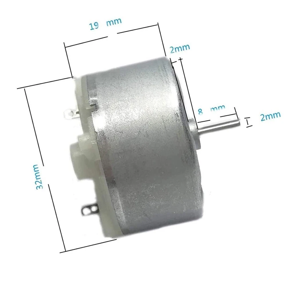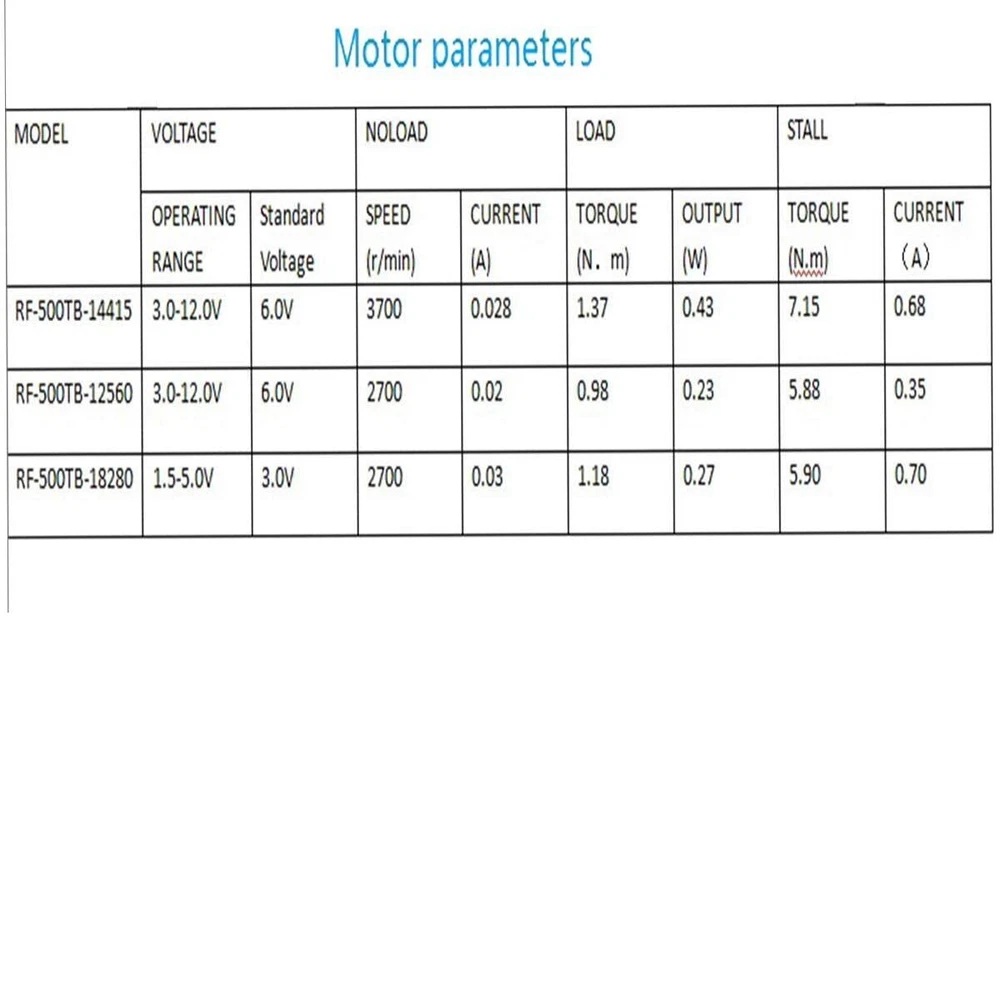 RF-500TB-18280 Mini Electric DC Motor 1.5V-5V 2700RPM DC Motor 32mm Diameter Motor, Pack of 2 Product Details Package Dimensions : 5.39 x 2.4 x 1.06 inches; 2.82 ounces Item model number : RF-500TB Manufacturer : Lagogia Brand: Lagogia Model Name: Mini Electric DC Motor Speed: 2700 RPM Voltage: 5 Volts Horsepower: 2700 Watts 【high quality】: material: 18280 DC motors, Using high hardness metal steel, good toughness, impact resistance, the quality of the bearing and the service life of the gear motor are improved, extremely durable. 【Specifications】:RF-500TB-18280 Working range: 1.5-5.0, Nominal value: 3.0V Speed:2230RPM, No-load speed:2700RPM; Load current: 0.16A, No-load current: 0.03A ,shaft size: 8 x 2mm / 0.31" x 0.078" (length * width) Motor size: 32 x 19mm / 1.25'' x 0.75" (D * H). 【Function】Using direct current to convert it into mechanical energy, Operate in any direction, just reverse the power polarity. 【Widely applicable】: Widely used in toys, DIY game consoles, DVD players, massagers, game controllers, CD players, cellpjone,etc. Product description:Name: RF-500TB-18280 DC Motorcharacteristic:The structure consists of a stator and a rotor. Used in many electronic devices: CD players, DVD players, VCRs, etc. 1. 2 threaded mounting holes. With welding eyes, easy to connect. 2. Low voltage and low current requirements make it an ideal motor for solar experiments. 3. Operate in any direction, just reverse the power polarityTip: Light shooting and different displays may cause the color of the item in the picture to be slightly different from the real item. Package contains: 2 x RF-500TB-18280 DC motors【No Risk Warranty】: Here with our 90-day money back risk-free purchase guarantee, Refund or Replacement for any quality problem.