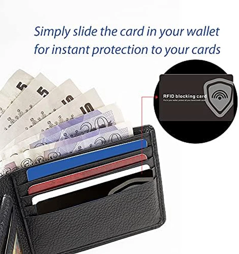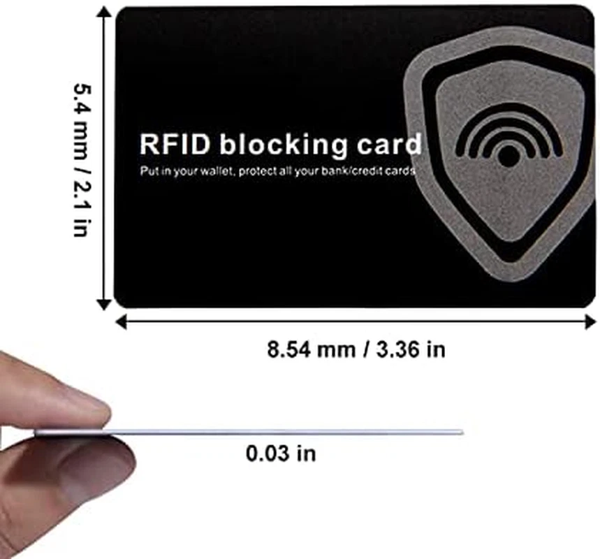 Safe and Secure : RFID blocking card can scramble and jam RFID signals, protects credit card, ID card, money card and other RFID enabled contactless cards. The RFID card is great protector for prevent other electronic scanning devices from stealing your privacy and money. Convenient and Slim : The size of RFID blocking card just as a credit card, can easily slips into the card slot in your wallet, very convenient and save space. Put one or two RFID blocker cards on wallet, the all the RFID card, band card date protected. Take Necessary : The RFID blocking card work on 13.56MHz frequency ( not works on cards and devices with frequency from 100-125KHz ) can protect your data from criminals who steal your personal information. Best Gifts : Our RFID blocking card credit protector with simple design and slim size, protect the data security and stop RFID theft. This card is the perfect gifts, provides extra peace of mind to your family, friends, self and others. Sweet service : If you have any problem with our RFID blocking card, please contact us and we will try our best to provide you with satisfactory solution to make things right. Product Description RFID Blocking Card * The RFID blocking card with advanced RFID blocking technology can secure your information. * Protect your personal information of credit card, identification cards, bank cards and etc. * Our RFID card is made of high quality materials, waterproof and weatherproof. * The safe RFID card suitable for many occasions, the best choice for traveling, dating, business and daily life. * The blocking card with advanced technology, compatible best gift for your family, lover, friend and others, show your special care. The RFID blocking cards work by drawing power from scanners and sending back signals to jam with communications. Clip the blocking card in your wallet for maximum protection. RFID protection is not 100% effective in all situations. The card protects surrounding cards within a 2 in range and it can stop transmitting personal information to remote RFID devices.
