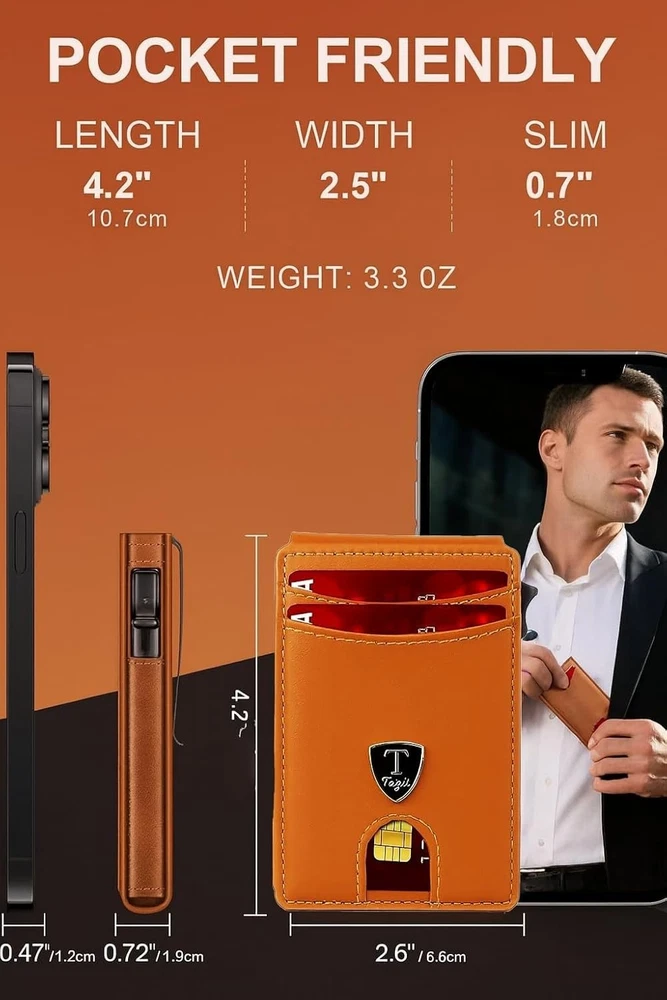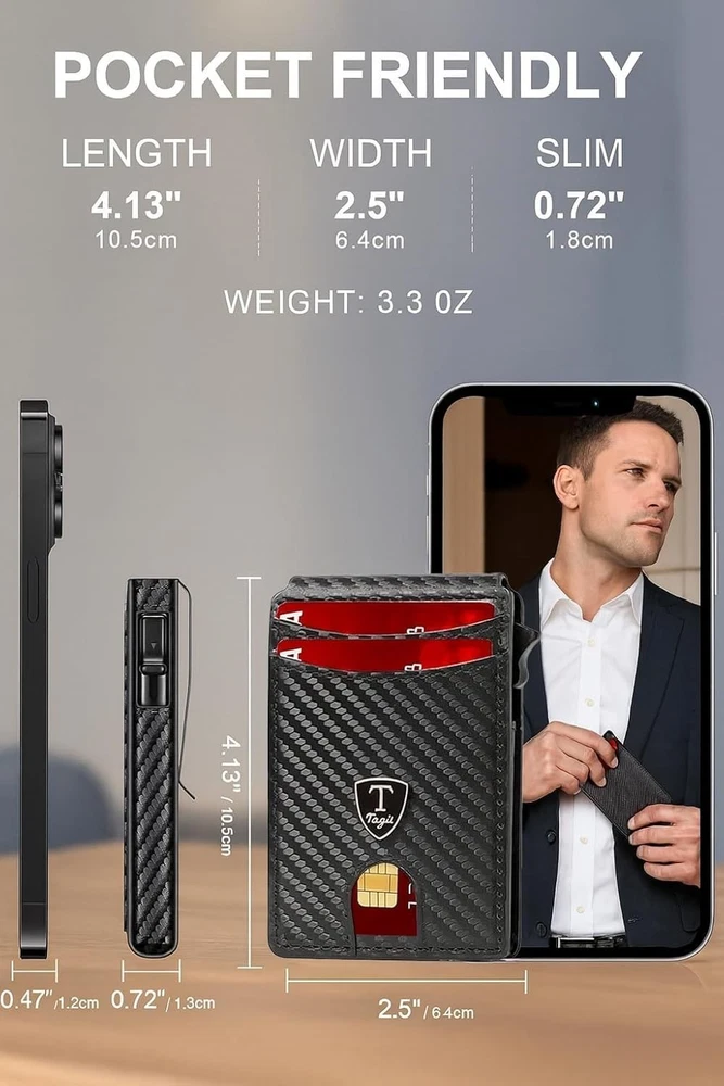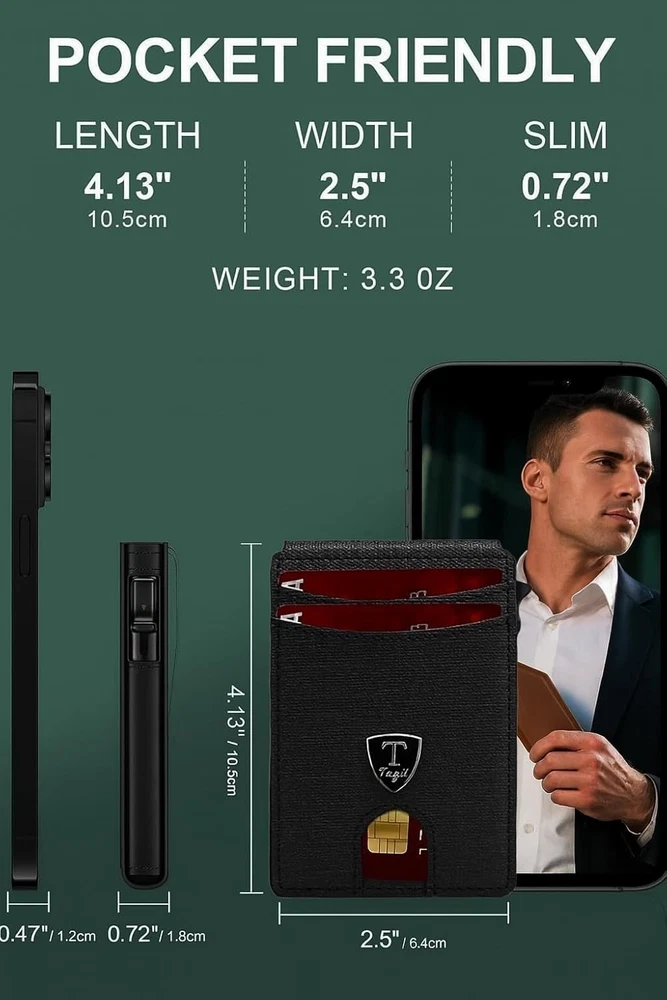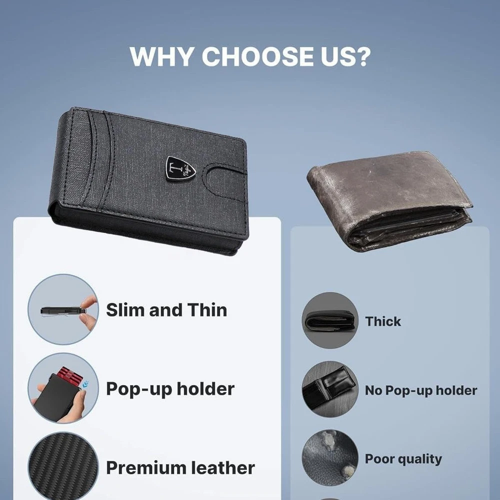 SLIM RFID WALLET – MINIMALIST DESIGN FOR EVERYDAY COMFORT Experience the perfect balance of style, function, and security with this modern slim wallet. Crafted for those who prefer less bulk and more convenience, it fits effortlessly into any pocket while keeping your essentials organized and protected. ✨ Features & Highlights ✅ Premium Craftsmanship: Made with a durable, water-resistant PU exterior for lasting performance. ⚡ Smooth Pop-Up Mechanism: Precision-built aluminum card holder allows easy access with one click. 🔒 Secure Magnetic Snap: Strong magnetic closure keeps the PU cover firmly attached to the card chamber. 💳 Spacious Capacity: Stores up to 18 cards, including a clear ID slot for quick visibility. 📏 Compact Yet Practical: Built-in metal money clip holds bills securely without extra bulk. 🚫 RFID Shielding: Advanced blocking technology prevents electronic pickpocketing. 👔 Modern Unisex Look: A versatile, elegant wallet suited for both men and women. 🎁 Perfect Gift Choice: Packaged in a premium gift box, great for holidays, birthdays, or special occasions.