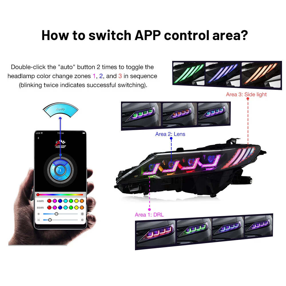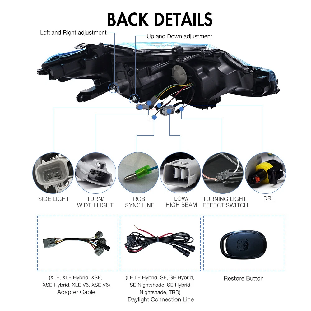 RGB LED Headlights For Toyota Camry 2018-2023 RGB DRL 8-Lenses Headlamp Assembly RGB LED Headlights For Toyota Camry 8Th Gen 2018-2022 Sequential Turn Assembly COMPATIBILITY: For Toyota Camry 8th Gen SE/LE/XSE/XLE/TRD 2018-2023 2018-2024 Please contact us before returning the products, we will do our best to help you solve all the problem well with good service! PACKAGE INCLUDES: 1 Pair headlights ( 1 x driver's side and 1 x passenger's side ) Plug & Play Harness Adapter FEATURES: 【Fitment】TT-ABC LED Headlights compatible with Toyota Camry SE LE XSE XLE TRD 2018 2019 2020 2021 2022 2023 2024 (Plug and play), headlights customized according to the original vehicle, perfectly fit your car. Package includes a pair of headlights (driver's side headlight and passenger's side headlight) 【Turn Signal with Special Design】Sequential Turning Signal/Dynaic Animation w/Breath Running Light. Breathing light and sequential turning signal in motion greets you upon your arrival or bid you farewell. 【Professional safety testing】Passed the IP67 test, with reverse polarity protection and open circuit protection, waterproof, shock resistant, dust-proof provide protection for your long-term use. 【Easy installation】Plug and play, no complicated procedures during installation, and no need for many tools. Please feel free to contact us, if you meet any problem while using or installing, we will reply you as soon as possible. 【After-sales】We provide perfect after-sales service, provide guarantee for product qualityand after-sales service guarantee. Sequential LED Turn Signal Plug and Play, Harness Adapter is included, All bulbs are built-in, no extra bulbs needed Black housing Great upgrade to enhance your vehicle's exterior Easy to install ( professional installation recommended ) DRL (White color)+Turn Signal (Yellow color)+High Beam+Low Beam lights High quality direct replacement part of the original headlights Waterproof, Dustproof, Shockproof These are the NEW redesigned version with better sealing and better LEDs Three year warranty Note: Please confirm the year of your car/light shape/ plug of your original lights whether these information as same as our lights, if you can't confirm it, please contact us. Please double check shipping address, We are not responsible for incorrect or undeliverable addresses.You can't change your shipping address after placing an order. Please Using your factory supplied connector/harness will avoid cutting or modifying any wires. We only provide electronic invoice "packing slip", if you need it, please note or contact us when you place an order. We will open the box and inspect the returned item to see if it is intact and the correct item before refunding you. If there is a problem with the product, please feel free to contact us, we can help you solve it as soon as quickly! Payment Delivery details After sales Contact us For tips Payment We only accept payment via eBay. Please make sure your eBay address is correct before you pay. Insufficient information will delay the order process so please read the invoice carefully during checkout. Delivery details To United States: 3-6 business days. Package will be sent out within 24 hours after the pament is received. Pick-up is unsupported servise. We will not be responsible for any delivery failure due to unclear address. Delivery is not available on weekends, public holidays or after business hours. After sales After-sale If it happens that the lights get moisture after you install them on your car, it would be normal for first time using. You just need to keep using for a period of days, the moisture will disappear. because there is inner air cycling in the lights as we design. As for headlights, you can also open the cover of low/high beam so that the moisture will out more quickly. If the moisture still exist, please feel free to send us message for help, we will try our best to help you. After you install, if you find that there have function does not work, please check if the harness is connected correctly, and exchange the left and right , If it still does not work, please rember take some photos or videos, please feel free to contact us. We will appreciate if you can takes some pictures or videos about your problem, and also send us the barcode of the products(every product we sell has a barcode on the backside of the light and outside of the package, it's very important for us to find the problem) If you open a request or case optionaly before communication, it would be hard for us to serve you. Contact us If you have any problem, please contact us or leave message for us for free. We will reply at once when convient. Don't worry, we always here waiting for your and like to help you. For tips There are some tips for you: 1. If There are any problems with the product, please contact with us before leaving any feedback or raise any dispute. 2. If you are in our exclusion countries. Please write to us for shipping .If When the goods arrive, please check them carefully 3. If you find that the goods have been damaged, please be sure to refuse to collect the goods and ask the courier to return the goods to us. If the goods are damaged, please do not collect. 4. If the item you have ordered is defective, contact us within the warranty period, we will replace the defective item for you with an item of equal functionality at first. 5. If buyer do not want neither replacement nor partial refund, but want returning,buyer should be responsible for all the returning ship charges.