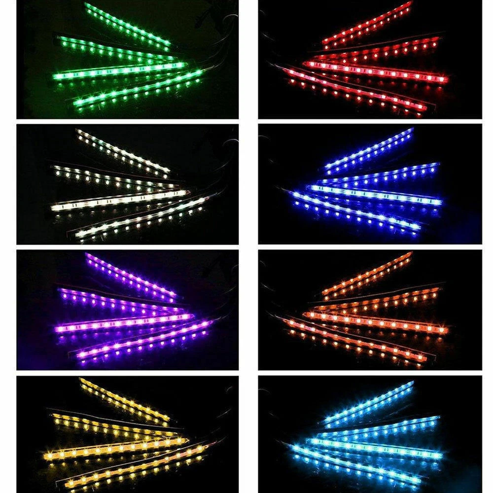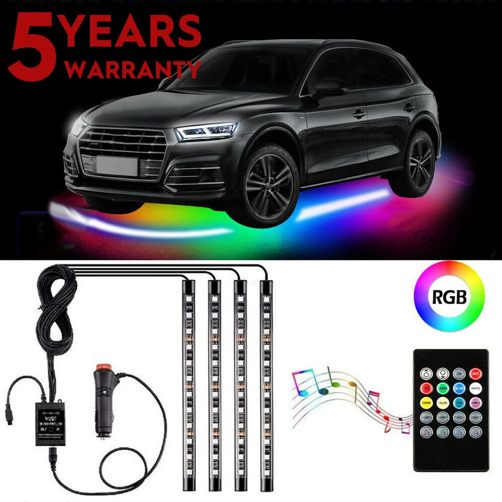Product Description: Decorative your car by this RGB LED Strip Lights, changing the atmosphere with different color and lighting mode. Enjoy a beautiful, exotic and romantic atmosphere tonight. Product Features:Music Control LED Strip Lights 100% Brand new and high quality. Music Sync : Syncs with music rhythms, adding dynamism and vitality to your car's interior Romantic Atmosphere : Easily change the ambiance with exquisite LED decoration for romantic nights. Product Specifications: LED Type: 5050 SMD, ensuring high quality1. LED Quantity: 48 pcs (4 tubes, 12 LEDs per tube)1. Compatible Vehicles: All cars with DC 12V power supply1. Smart Control: Wireless Remote: Adjust 8 basic colors, brightness, speed, and patterns with ease. Plug-and-Play: Built-in switch on the cigarette lighter socket, no wiring modifications needed Installation & Usage: Easy Installation: Double-sided adhesive tape for quick setup on the car's interior floor or dashboard1. Versatile Applications: Suitable for car decoration, homes, bars, and other venues Note: The Total 16 colors includes 8 bright cyan/red/green/blue/white/orange/yellow/purple colors and 8 deeply cyan/red/green/blue/white/orange/yellow/purple colors. Easy to Install No need to modify the wiring, simply peel off the double-sided tape behind each strip and apply them under the seats or in the footwell area. A built-in switch on the cigarette lighter socket, easy to turn it on/off, no need plug and pull frequently. Specification Device Type: RGB Car Decorative Light Strip Strip Light Quantity: 4pcs LED Type: 5050SMD LED Quantity: 12pcs for one strip light Strip Light Size: 8.66" L x 0.55" W x 0.2" H (222 x 14 x 6 mm) Applicable: With cigarette lighter head, no need to modify the circuit. Material: PVC Voltage: DC 12V Power: 6W Power Cable Length: 2 cables: 6.3ft (1.92m), Other 2 cables: 4.6ft (1.42m) Weight: 7.83 oz (222g) Colo r: white/red/blue/green/ice blue/orange/yellow/pink purple Package Includes 4* Music Control LED Atmosphere strip light 1* Remote Controler 1* USB