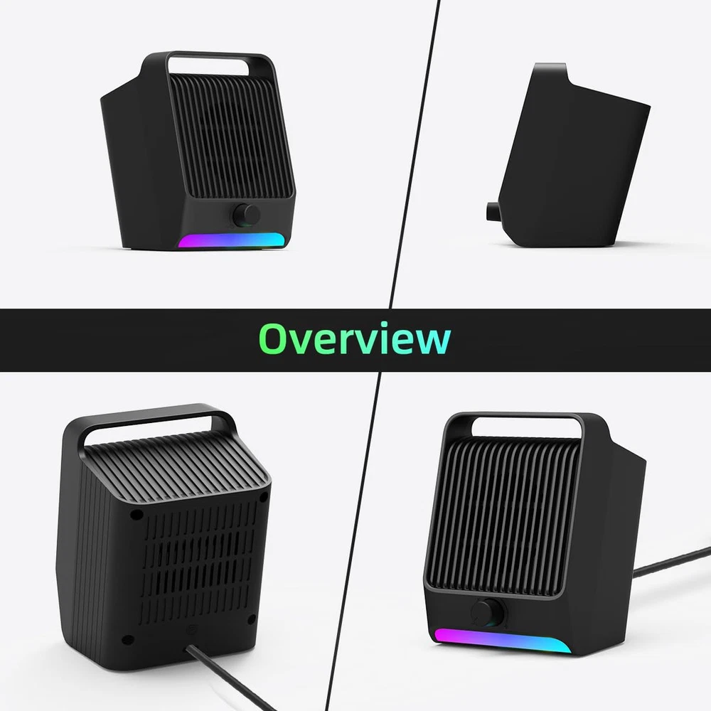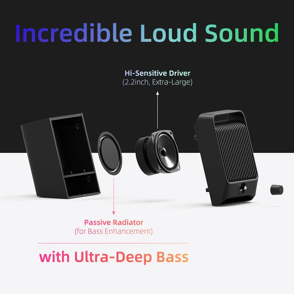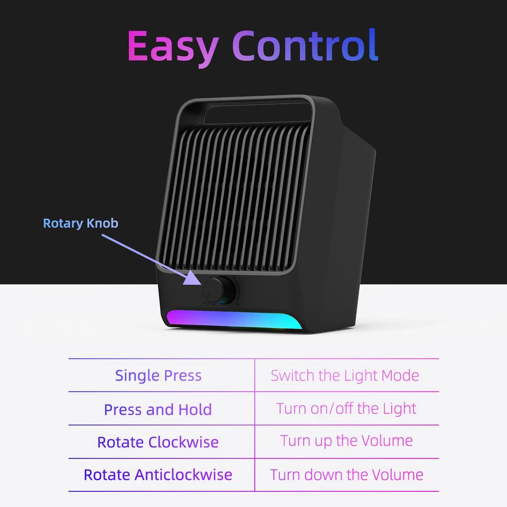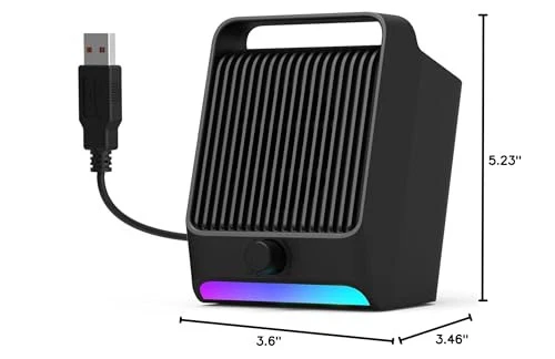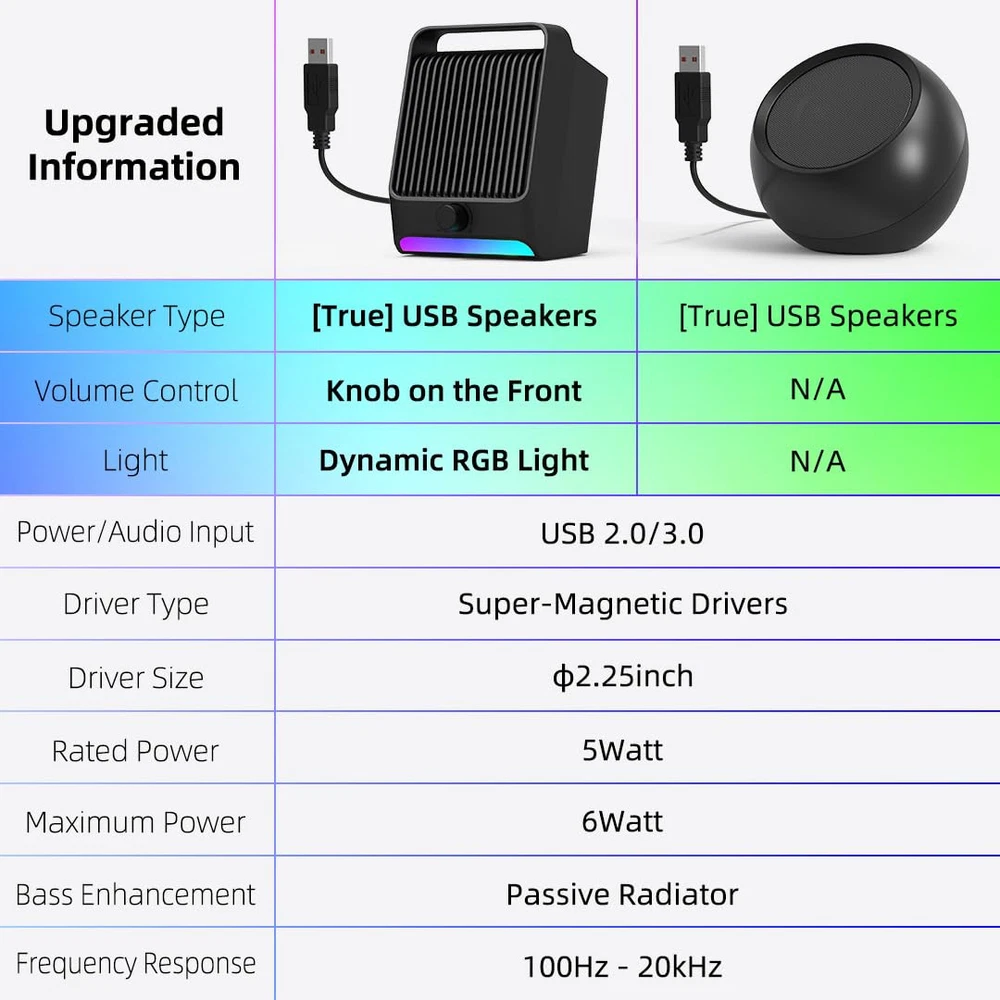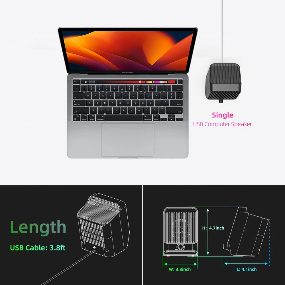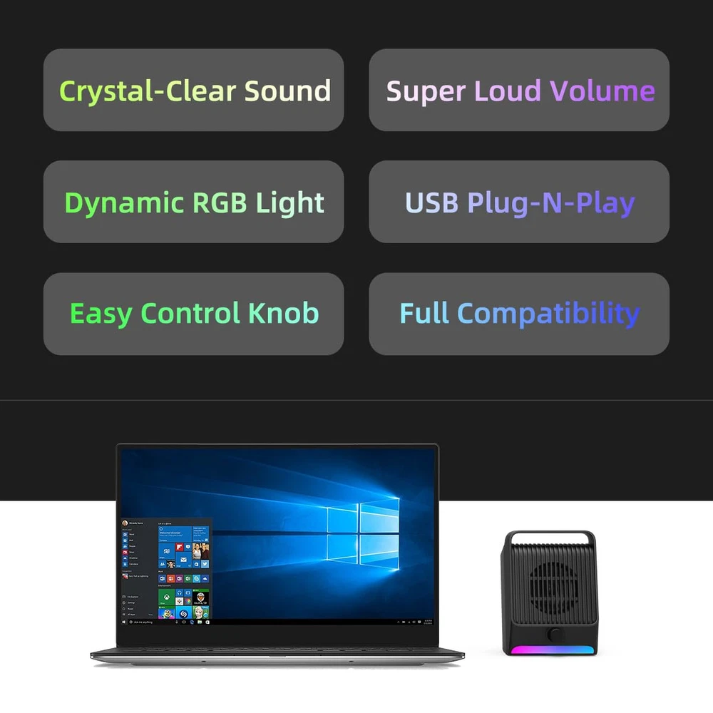 IMPRESSIVE SOUND EXPERIENCE: The incredible loud sound and ultra-deep bass are delivered by a large speaker driver and passive radiator. INCREDIBLE LOUD VOLUME: Compared with the other 2.0inch speaker drivers, our single USB speaker has upgraded to 2.25inch larger speaker driver, which increase the sound volume by at least 15%. DYNAMIC RGB LIGHT SHOW: Brings a new level of excitement to your desktop with colorful light show that syncs to the beat of the music/movie. QUICK CONTROL: The rotary knob on the front allows you to quickly adjust the volume and easily switch the dynamic RGB light mode. USB PLUG-N-PLAY: NO 3.5mm headphone jack, NO static noise and NO driver software. Just plug in the USB cable, then the speaker will bring you crystal-clear loud sound. FULL COMPATIBILITY: This USB Computer Speaker is a great external speaker for your Windows/macOS/Chrome OS/Linux PC, laptop and desktop computers.
