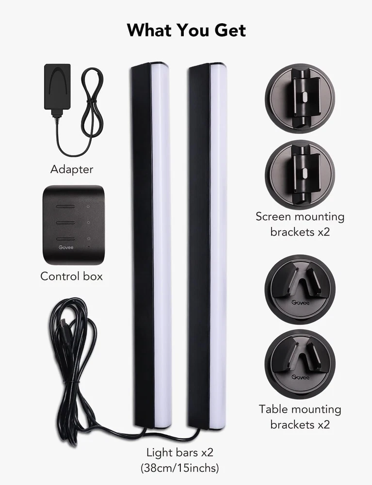 RGBIC Light Bars, 15 Inches WiFi TV Backlight with Double Light Beads, Smart Light Bars with Multiple Placement Options Suitable for 45-70 inch TVs, Work with Alexa and Google Assistant, Black Created For Your TV: Bring your entertainment, movies, sports, and gaming to life with the RGBIC TV Light Bars. Use with the Home App to control your light bars remotely or brighten your walls with preset scene modes and music modes. RGBIC Effects: Enjoy vibrant RGBIC lighting effects for your TV. With the included back buckles, the TV light bars can be rotated freely up to 90°, allowing for a wider spread of the lighting extra hub needed) Smart Voice Control: Use your voice assistant devices to turn your lights on and off, change scene modes, and more with Smart Voice Control. Pair your TV light bars with Alexa and Google Assistant to enjoy hands-free voice control. 8+ Dynamic Music Modes: Turn your lights into a dance party using Music Mode on Home App. Choose from 8 diverse music modes to create a lively party scene for your space. Easy to Set Up: The TV light bars can be adjusted three ways to fit your lighting needs. Use the mounting brackets to mount them behind the TV or stand them next to the TV. The light bars can also be placed horizontally without the mounting brackets.