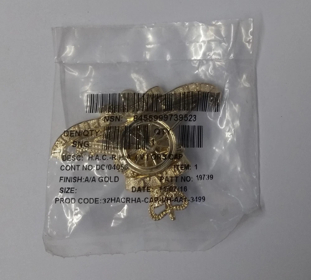 RHA HAC Badge Visor Cap Dress Hat Royal Horse & Honourable Artillery Company Genuine issue regulation badge featuring the R.H.A & H.A.C insignia Great for customization, costumes or collectors Size: 68mm x 45mm Approx Condition: NEW (unissued) NSN: 8455-99-973-9523 Please contact me for any further information. Thanks for looking RHA HAC Badge Visor Cap Dress Hat Royal Horse & Honourable Artillery Company Genuine issue regulation badge featuring the R.H.A & H.A.C insignia Great for customization, costumes or collectors Size: 68mm x 45mm Approx Condition: NEW (unissued) NSN: 8455-99-973-9523 Please contact me for any further information. Thanks for looking