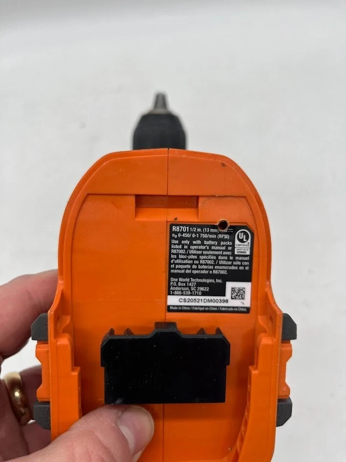 Number of Batteries: 0 Chuck Size: 1/2 in MPN: R87012B Item Weight: 2.0 lb Type: Drill Voltage: 18 V Battery Technology: Lithium-Ion (Li-Ion) Seller Notes: “Item shows some signs of use. Tested and works fine as seen on video.” Brand: RIDGID Set Includes: TOOL ONLY Model: R87012B Number of Items in Set: 1 UPC: 648846085159 Battery Included: No Features: Compact Item Width: 3.3 in Auxiliary Handle: No Chuck Type: Keyless Color: Orange Motor Type: Brushless Power Source: Battery Manufacturer Warranty: N/A gtin13: 648846085159 Item Height: 7.7 in