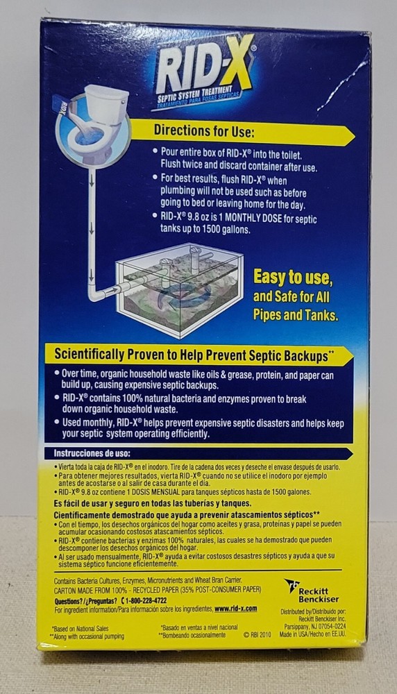 Number in Pack:1Capacity:up to 1500 gallonsType:UnblockerStyle:Septic System TreatmentFormulation:PowderBrand:Rid-XPersonalization Instructions:Rid-XDepartment:Septic Tank TreatmentsFeatures:Disposable, Portable, Powder FreeFor:ToiletForm:PowderMPN:1920080306Volume:Fragrance FreeItem Weight:0.6lbs