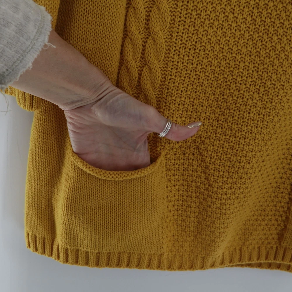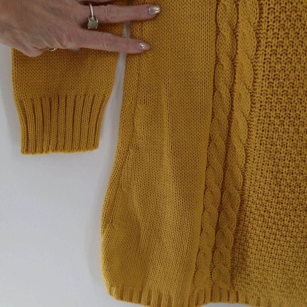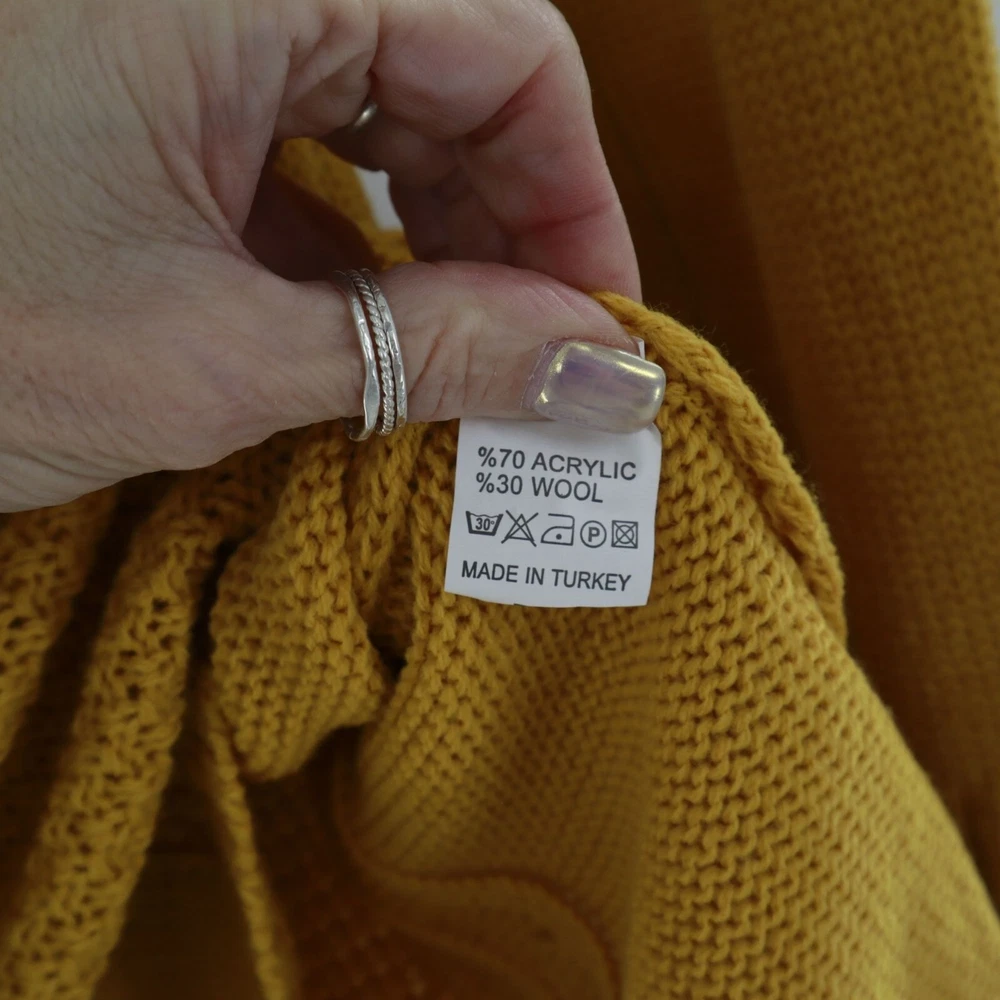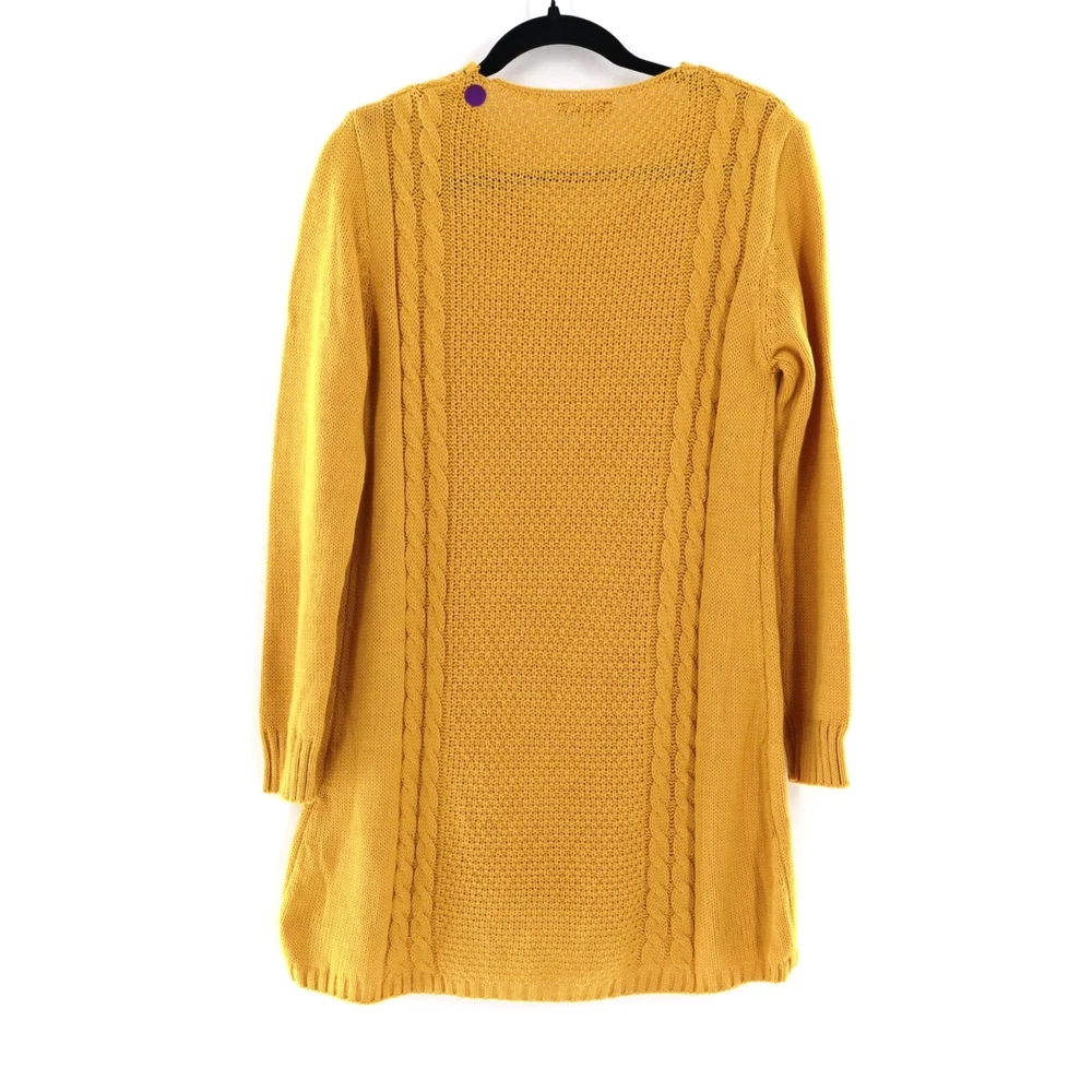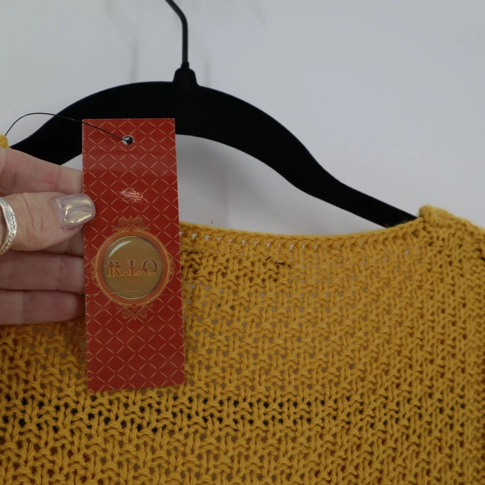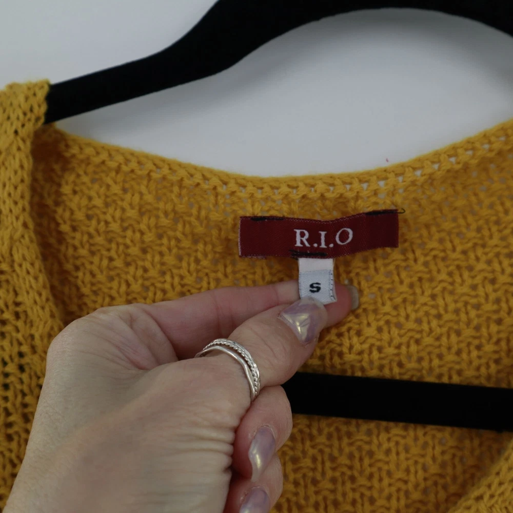 R.I.O Open Knit Wool Sweater Dress Women's S Yellow Mod Fall Boho Bohemian Twee Ever feel like a walking sunshine? This mustard dress will make you the sunniest in the room. It's like wearing a hug from a sheep. • V-neck design • Two front pockets • Ribbed cuffs • Tunic • Stretchy & lightweight Features: mod, fall, knit dress, tunic, sweater dress, mustard, wool blend, bohemian, twee Size: Womens S Condition: New With Defects There's a yarn that has been pulled at the upper back side of the neck.