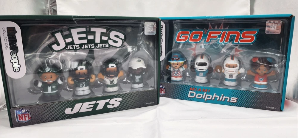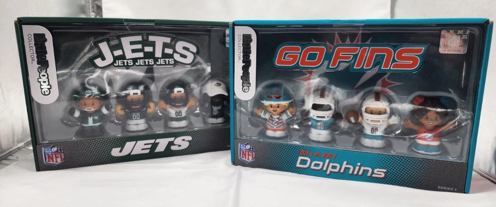 Package of 2. NFL Rivals New York Jets and Miami Dolphins. Unique bundle sold together! ***Check out my other listings for other collectors items!*** NFL officially licensed. New, sealed in box. Model # HND10 AND HND14/ Series 1 Free shipping for both! In Stock. Ships same day when ordered before 6pm EST. Get ready for some fun with the RIVALS Jets vs Dolphins NFL Little People Limited Ed New Sealed 2-Pack! This set features two adorable plush toys with the beloved characters from the NFL Dolphins team. The toys are made by Fisher-Price, a trusted brand in the world of toys.