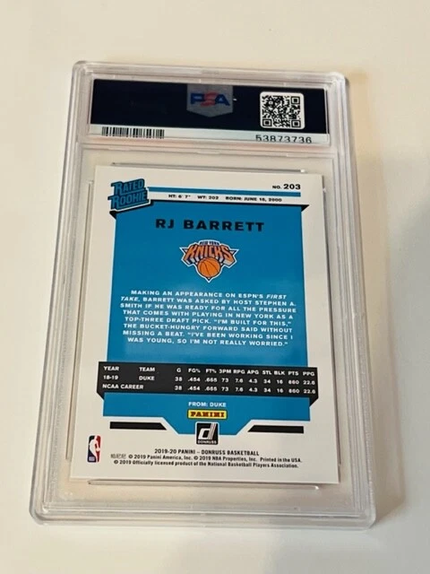 RJ Barrett Knicks Rookie RC 2019-20 Donruss Holo Infinite PSA 10 GEMA COMO NUEVO #203