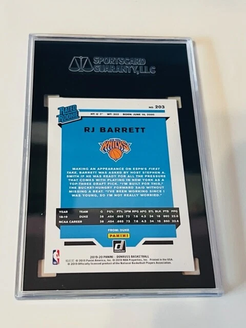 Absolutely awesome and highly collectible RARE 2019-20 RJ Barrett Graded Rookie Card. See all pictures for amazing condition, size, and detail. There are absolutely no returns on graded sports cards as you know exactly what you are getting because it is professionally graded and the market for sports cards changes literally on a daily basis. Check out my store for some of the rarest vintage collectibles online from all eras. Thanks for looking and have a great day! :)