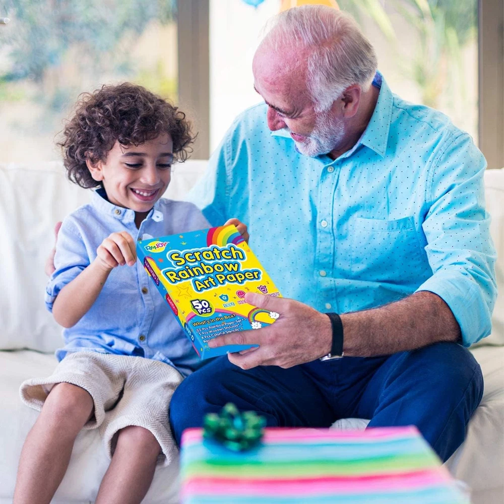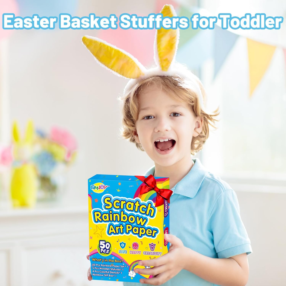 Easter Gift for Kids & Easter Basket Stuffers for Toddlers: these funny party favors art toys are super perfect to draw or do coloring painting! Keep spirits high with creative art supplies! Simple and fun crafts for kids are a great way to stay thoughtfully engaged and entertained. Magic boy's gift for Easter, Thanksgiving, Children's Day, Holiday, Birthday, Christmas or just for creative fun Easter Crafts for Kids and Adult: our art sets are suitable for kids who age 3 years and up. As a creative drawing activity, simple painting can develop children's key abilities, including fine drawing skills, imagination or creativity. Kids can use our colorful stencils or get creative to make each works their own! What's more, for parents, it can bring closer to children, increase intimacy Shinny Rainbow Art Paper Craft Set: our art paper sets features 60pcs rich & vibrant rainbow paper pieces that highlight the details of every coloring paper and art project; The valua art set are includes 50pcs scratch paper combined with shining gift box for easy to carry or store, 6 wooden styluses and 4 mini colorful stencils, meet your art project needs Creative Design & Easy to Use: Our craft kit comes with different types of drawing stencils, rainbow papers and wooden styluses for the kids to use! Art painting sets are a great alternative because they will encourage your kids to draw or create everything he likes. It will also increase the likelihood of your kid sticking to art projects because of they are easy to use Safety & Less Mess Craft Sets: our paper craft kits are made of premium paper making it extremely thick and hard to damage or torn; These scratch paper are a portable art set that allows kids to drawing line art or all kinds of patterns. It's a less mess & easy to clean, perfect art kits for all ages people who loves to draw Product Description Easter Basket Stuffers for Toddlers Easter Crafts for Kids! RMJOY art craft kits will be a great choice for you.No ink, no paint, no-mess painting, while support happy and safety for your kids. What a great idea to enjoy the pleasure of the parent-child time! Inspire Children's Artistic Talent Art Decoration for Kids Room Drawing any unique pattern according to your imagination, and then trim it out and used it as an art decoration, which will be a special crafts. Thickness Paper Our rainbow papers are made of good quality & thick paper, won't fade and deform easily that's allow your kids fun for it with a long period No Toxic Powder, Safe & Clean These scratch rainbow art papers no terrible flavor & easy to use that allows your kids spend their time to draw and create their masterpieces. What will the kids get PACHAGE INCLUDES 50 x Rainbow Paper Sets 6 x Wooden Styluses 4 x Colorful Stencils 1 x Rainbow Gift Box Handmade to make you smile. Crafting memories together. Big fun for little hands. Expressions of warmth and love 1 Mess Free Activity 2 Parent-child Fun Time 3 Get Away from Electronics 4 Love Gift Cards Easter Gifts for Kids Rainbow Scratch Paper are perfect gifts for 4 5 6 7 8 years old as birthday gifts, class gifts, Easter gifts, Thanksgiving gifts, Christmas gifts. Kids will find fun in our scratch paper! CLEAN & MAINTENANCE 1. Cleaning *Before drawing, choose a smooth desktop or floor *After drawing, just wipe out the mess with a wet towel 2. Maintenance * Made of paper, not waterproof, please store in a cool, dry place. * After used, place in a box to avoid loss CAUTION * Use the scratch under adult supervision * Not for children under 3 yrs