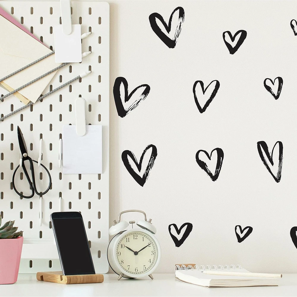 Comes with 76 wall decals; decal range size 1.32 inches x 1.33 inches to 2.48 inches x 3.52 inches Applies to any smooth, clean surface Removable and repositionable with no sticky residue left behind Reuse from one space to the next Perfect for both renters and homeowners Proudly made in the USA, fully CPSIA compliant, free of harmful chemicals and are non-toxic Playfully romantic, these Sketchy Hearts peel and stick wall decals from RoomMates make a happy statement on walls, furniture or lockers. The whimsical doodle heart art is in inky black and coordinates with both bold and simple color palettes and hundreds of décor styles. Feel the love wherever you apply them! RoomMates wall decals are an easy and affordable way to decorate in minutes. Reposition or remove them effortlessly with no remaining sticky residue or damage to walls.