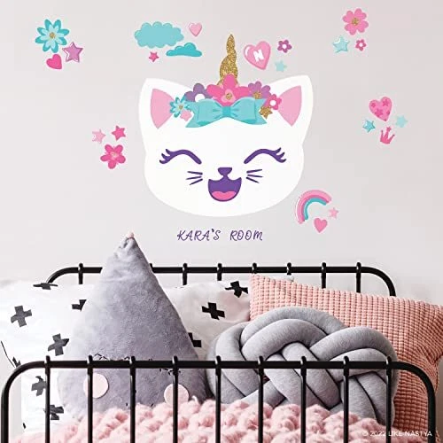 Purrfectly precious, this officially-licensed Like Nastya Unicorn Cat Giant Peel and Stick Wall Decal set celebrates the bubbly aesthetic of the channel, Like Nastya! Installing this set of decals is as easy as peel, stick, done! Featuring a white unicorn cat and various clouds, hearts, stars, and an array of alphabet letters, this set is perfect for any Like Nastya fan! Decal size(s) - .82 inches x .80 inches to 15.30 inches x 16.21 inches. Has glitter accents. Easy to apply - just peel and stick Applies to any smooth, clean, flat surface; product may not adhere to unclean, textured, recently painted, or nonstick surfaces Removable and repositionable with no sticky residue left behind Perfect for both renters and homeowners