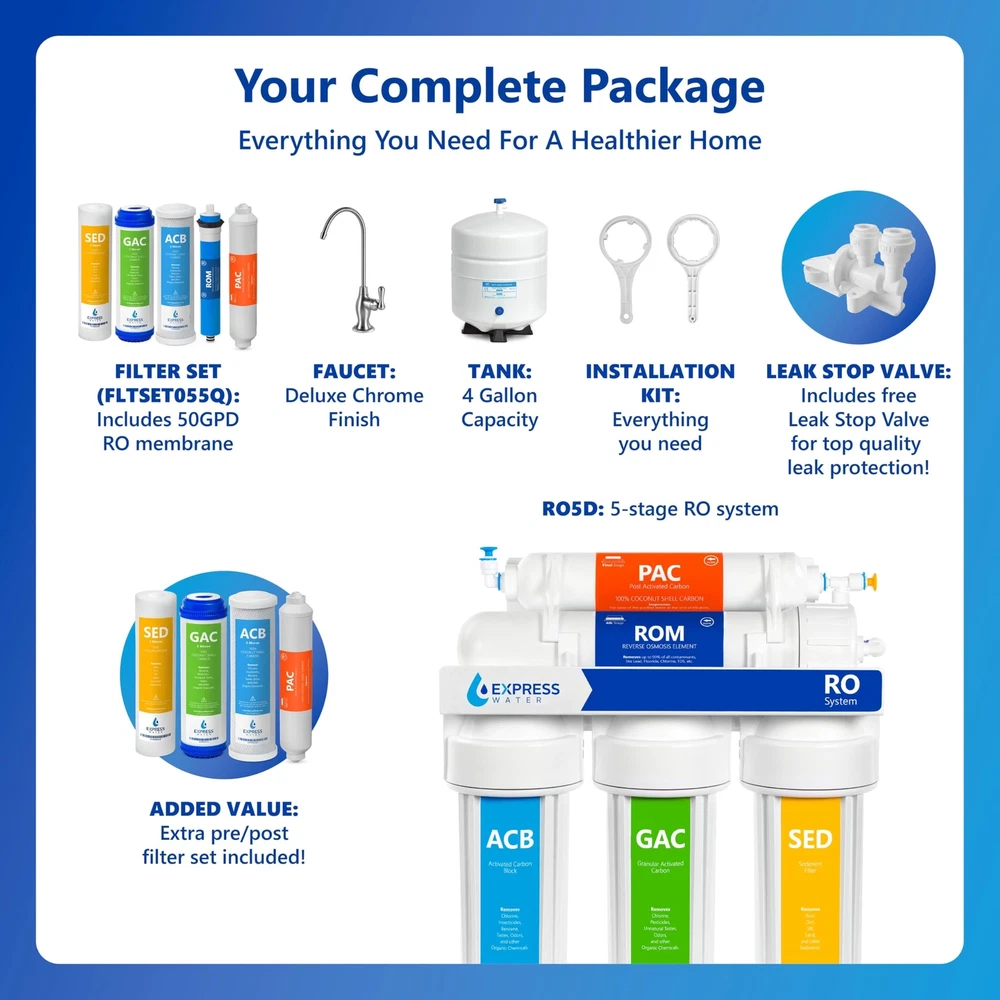 Make the purest water with your own home reverse osmosis system. Great in the kitchen: improve the taste of your cooking, coffee, ice, and drinks. experience true reverse osmosis water. Get setup fast with our quick connect tubing system. Includes fast flow faucet with 0.8 gpm delivery. a compact water filter for sink made to fit under counter in a cabinet. Best for house, apartment, residential, well water, industrial, rv, and office uses. Certified by an independent laboratory to NSF standard. Comes with 4 gallon (3.2 gallon water capacity) storage tank and tank stand. Includes all filters needed for setup and first year of use. Can be wall / cabinet mounted or freestanding, made for indoor use. Can be installed undersink, in a basement or other remote locations, you may need additional tubing or a delivery pump depending on how far away you plan to install or if you plan to link to a refrigerator as well. For every one gallon of water produced the system discharges between one and three gallons (depending on the pressure and quality of your incoming water). The system is compatible with 3/8" and 1/2" under sink connections. includes filter housing wrench. Operates on 40-80 psi water pressure, you may need a booster pump or pressure regulator depending on your water pressure. The water is cleaner and more convenient than any pitcher, faucet filter, or countertop systems. ’s 5 stage reverse osmosis water filtration system RO5DX is the complete solution for your drinking water. Reverse Osmosis Water Filter: Experience what water should taste like with the reverse osmosis water filtration system reducing up to 99.99% of Lead, Chlorine, Fluoride, Nitrates, Calcium, Arsenic, and more. Water Purification System: Drink the healthiest water on Earth. All our water filters are specially engineered to work together, producing the safest and best tasting water you’ll ever drink Under Sink Water Filter: Don’t waste money on professional installation. ’s quick and easy-to-understand design means you can install and understand everything about your new water filtration system Under Sink Water Filter System: No need to mess with refilling or activating your water filter, ’s water filtration systems automatically fill your water tank with high quality drinking water Leak Detection: Each under sink water filter includes an emergency leak stop detector that shuts off water flow when it detects unwelcomed moisture Customizable RO Water Filter System: home water filtration systems are fully upgradable and customizable with quick connecting fittings. Try additional filtration attachments including UV Water Filter, Alkaline Water Filter, Deionization Water Filter, and more On Demand Support: Support from experts who can answer any of your questions about your new water filter Help Has Arrived - Support from experts who can answer any of your questions about your home’s water Love your water - Environmentally friendly coconut carbon filters give unequalled quality and a clear natural taste