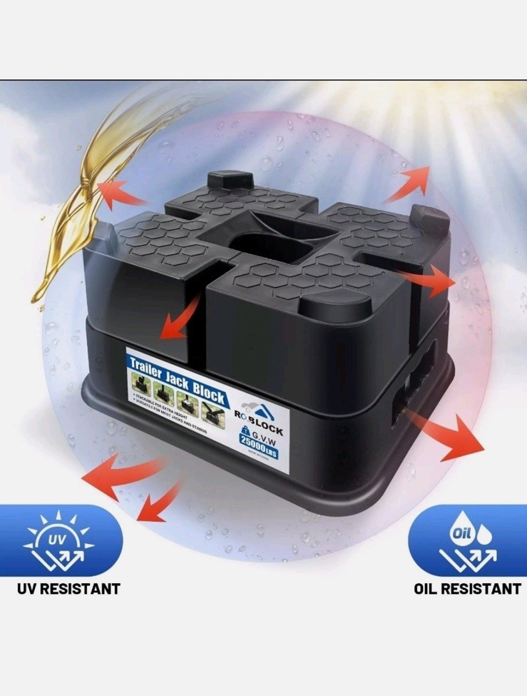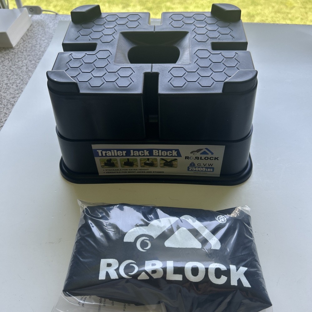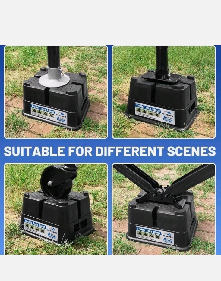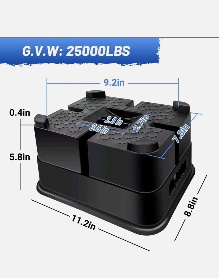 Open box New item! 【All-in-One Function】: Supports nearly any tongue jack foot, wheel jacks, 9” round 5th wheels hydraulic jack foot or Scissor Stabilizer and more! ELIMINATES NEARLY ALL MOVEMENT AND SWAY in parked RV's and Trailers. 【DIMENSION】: Each size is: About 6.3" tall, L:11.2", W:8.9". 【Heavy Duty Construction】: RV trailer jack blocks are built with a high-performance polymer and added anti-UV aging additives to resist dirt, grime and oil for years of rugged use. Rated at 25,000 lbs per block. 【Adjustable Height】 Each RV jack block features a stackable design, allowing you to easily adjust the height according to your needs. This flexibility ensures that you can achieve the perfect leveling for your camper, even on uneven surfaces. 【Convenient to Store & Carry】: The holes on the side of the product and the storage bag with it are convenient to store and carry, saving space.