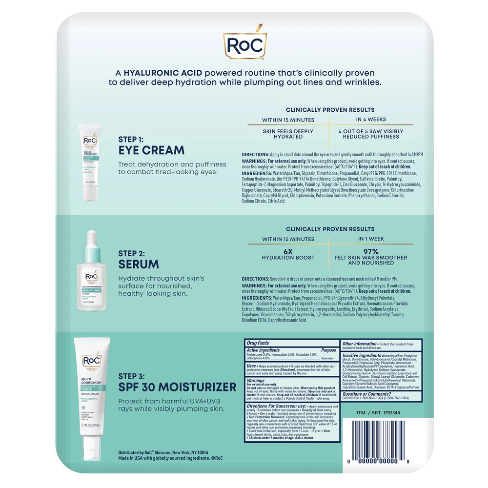 DESCRIPTION: RoC Derm Recommended Hyaluronic Acid Regimen Pack -Simplify your skincare with this Dermatologist recommended 3-step morning routine for visibly plumper, hydrated skin -In this set you’ll find the following 3, clinically proven items -Eye Cream: Combines Hyaluronic Acid and caffeine to help re-awaken the eye area: 4 out of 5 saw puffiness visibly reduced -Serum: Powered by Hyaluronic Acid and Collagen proteins to boost hydration 6X and nourish skin -Moisturizer with SPF 30: Apply in the morning and don’t forget to re-apply about every 2 hours for deep hydration and sun protection. 100% saw visibly plumper, bouncier skin DIRECTIONS •Eye: Apply in small dots around the eye area and gently smooth until thoroughly absorbed in AM/PM. •Serum: Smooth 4-6 drops of serum onto a cleansed face and neck in the AM and/or PM. SPF 30 Moisturizer: Apply onto face and neck in the AM, re-apply as needed. See Drug facts box for full instructions. SPECIFICATIONS: Package contains: (1) Hyaluronic Serum 1.0 fl oz (1) Hyaluronic Moisturizer SPF 30 1.7 fl oz (1) Eye Cream 0.5 fl oz Visibly Plumps & Hydrates