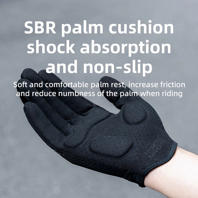 Details: Brand:ROCKBROS Product name:long finger cycling gloves Item number:16110009 Material:55%Nylon+45%PU(Palm),82%Nylon+18%Spandex Weight:about 30g Size:S-XXL Product Features: Brocade ammonia material,high elastic,soft and comfortable to wear Overall large ventilation holes,breathable and not stuffy to wear SBR palm pad, shock absorption and anti-slip Dual guide electric fiber cloth,more convenient to use phones without removing gloves Fits snugly in both hands and maneuvers the handlebar flexibly
