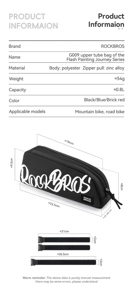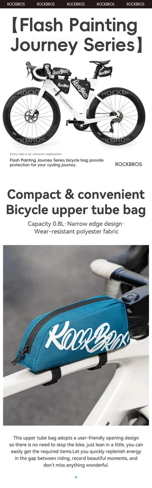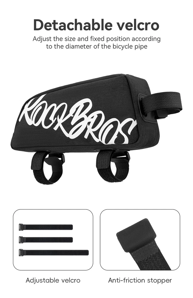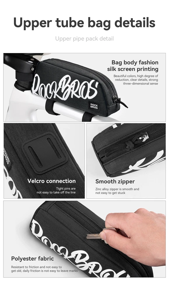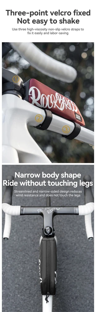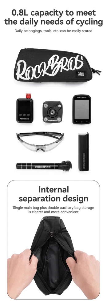 Number of Pockets:1Sport/Activity:CyclingBrand:RockBrosMaterial:PolyesterCompatible With:Road-BikeFeatures:High Visibility, Lightweight, SoftshellType:Frame BagCapacity:0.8 LClosure:ZipPosition:Front