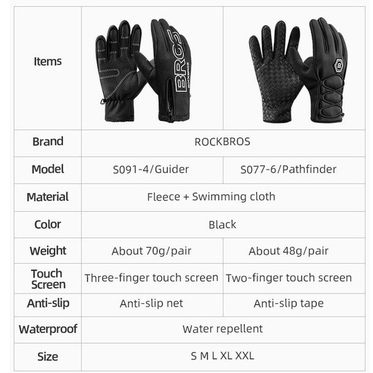 Product Details: Brand: ROCKBROS Material: Velvet Weight: About 48 g / pair Touch screen: thumb, index finger Waterproof: Water repellent Feature: add velvet to keep warm, touch screen, water repellent Size: Size S M L XL XXL Palm Width 2.76-2.95in 2.95-3.15in 3.15-3.54in 3.54-3.94in 3.94-4.72in Palm Circumference 6.69-7.08in 7.08-7.48in 7.48-7.87in 8.26-8.66in 8.66-9.49in