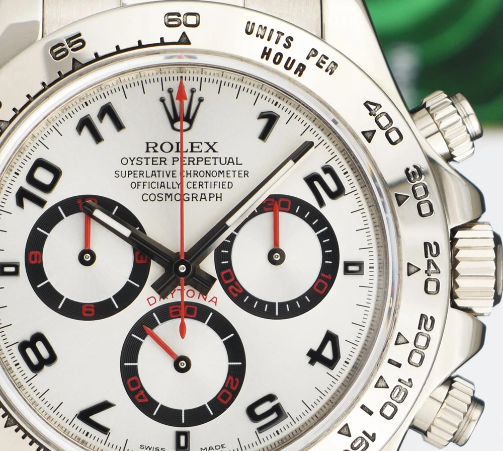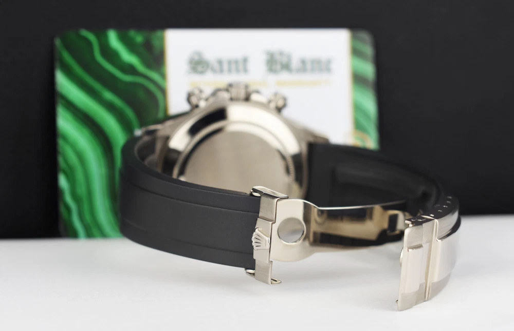 ROLEX - 18kt White Gold Daytona - Silver Dial - Model 116519 Authentic Rolex ROLEX - Factory Silver Arabic Dial ROLEX - Men's 18kt White Gold Daytona ROLEX - Men's 40mm Cosmograph Daytona Timepiece Details Absolutely Stunning brilliant Rolex Factory Silver Arabic Dial! This is the 40mm size 18kt White Gold Rolex Daytona model 116519: This is the style with rubber strap. This Rolex is in pristine condition...Priced to sell immediately! Comes with genuine Rolex presentation boxes, Rolex books, Rolex tag, Retail Appraisal And The Sant Blanc Three Year Warranty!...In pristine condition...The Perfect Gift! This Rolex is authentic and stunning. Unconditionally guaranteed to be authentic Rolex. "Please serious bidders only." I have set the reserve well below the current value placed on this timepiece. SANT BLANC is a Swiss watch and timepiece specialist and not a Rolex dealer and have no affiliation with Rolex Watch USA. This Rolex timepiece is unconditionally guaranteed to be authentic. We are the sole warrantors of this timepiece. For questions please contact SANT BLANC. Authentic Rolex. It does not get any better than this! Pictures do not reveal the radiant beauty of this timepiece. This Rolex is authentic and stunning. Unconditionally guaranteed to be authentic Rolex. Returns & exchanges accepted. Returns for refund are accepted.. I have set the reserve well below the current value placed on this timepiece. I am a Swiss Timepiece Specialist and not a Rolex dealer and have no affiliation with Rolex Watch USA. This Rolex timepiece is unconditionally guaranteed to be authentic. No factory warranty attached. We are the sole warrantors of this timepiece. For questions please contact SANT BLANC. Payment must be received within 5 days of the end of the auction Payment Information The winning bidder must contact us within 2 days and payment must be received within 5 days of the close of this auction. If you you are unable to complete payment within 5 days, you must contact us immediately by contact SANT BLANC . Guarantee This article meets or exceeds the demanding standards and specifications set by Sant Blanc. This item is authentic and genuine in pristine condition, functions properly and accurately and comes with a full seven day return money back guaranty. We are not responsible for photography and description errors and omissions in this auction. Changes and modifications to this description may be made at any time, and for any reason with out notice. This auction may be ended at anytime without notice. Warranty SANT BLANC warranty is for a full three years. The dependable operation of this article for a period of three years from the date of purchase. Modification, tampering and abuse void warranty. SANT BLANC is the sole warrantor of this article, the factory warranty no longer apply. SANT BLANC Service & Warranty Division and The SANT BLANC Service Center, services and repairs Swiss Made watches and timepieces. The SANT BLANC Service and Warranty Division has over 30 years experience as Swiss Timepiece specialist factory trained and certified "Watchmaker". The credentials include AWCI CW21 certified as one of the world's leading watchmaker. Our watchmaker is a certified graduate watchmaker with continuing Swiss Watch education including training from the Rolex Dallas Training Facility. Sant Blanc is dedicated to setting the highest standards in Swiss Timepiece excellence. We have a complete Swiss watch service center. We do our own in-house photography, and research. Please contact us if we can be of service to you. Shipping Information FedEx/UPS shipping is included.. This item is professionally packaged and shipped fully insured, adult signature required at delivery. We ship via FedEx, UPS, Brinks, Private Courier and United States Express Mail. Items are typically shipped within two business days of receipt of payment. You will be notified when your item has been shipped. We are not responsible for shipping and/or delivery delays resulting from acts of nature, theft, strikes, or shipping company errors affecting the shipment and/or delivery. This shipment is fully insured.. We ship world-wide fully insured by: UPS, FEDEX, BRINKS, Private Courier, and United States Express Mail. ATTENTION International Customers. NOTICE: International shipments are shipped at the customers risk to shipping delays, international and national regulations, Customs fees, taxation, and damage due to and/or resulting from shipping. We are not responsible for shipping delays, damage, theft, acts of nature affecting the shipment, Customs duties, fees, taxation or regulatory import restrictions . This disclaimer applies only to shipments outside the United States, and does not apply to shipments within the United States. Arrangements must be made for delivery to PO boxes. Provide a physical address, and contact contact SANT BLANC through eBay through eBay number with your payment. If payment is made by PayPal, and your shipping address is different than your confirmed address in PayPal, you must contact us directly to let us know of the requested change. Address change approval will be sent to you, otherwise this item will be sent to your confirmed PayPal address. About Sant Blanc SANT BLANC is a Swiss Timepiece Specialist Company, located in Branson Missouri USA. The Sant Blanc Service Center is a state of the art service facility, servicing all Swiss Made watches and is open to our customers by appointment. The Sant Blanc Sale Division specializes in offering the finest Swiss Made Timepieces. Notice: SANT BLANC is not an official nor an authorized dealer for any product offered or sold and SANT BLANC has no affiliation with the manufacturer. All brand names and trademarks are the property of their respective owners and are used for identification purposes only. SANT BLANC is the sole warrantor. the factory warranty no longer apply. Rolex is a registered trademark of Rolex Watch USA Inc. SANT BLANC is not affili