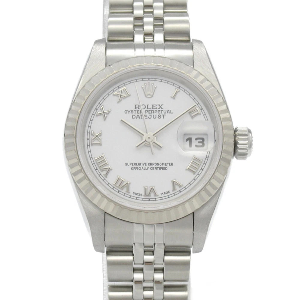 Reference Number: 79174 Water Resistance: Waterproof 100M Country of Manufacture: Switzerland Type: Wristwatch Lug Width: 12mm Style: Wrist Watch Size Type: Regular Band Material: K18WG(White Gold) Frame Color: White UPC: Does not apply Model: ROLEX Datejust F Series Watch Brand: ROLEX Movement: Automatic gtin13: Does not apply Water Resistance Rating: Waterproof 100M Material: K18WG(White Gold) Case Size: 26mm Department: Women Color: White Size: Regular Seller Notes: “Good:There are a few scratches, stains and looks a little used.”