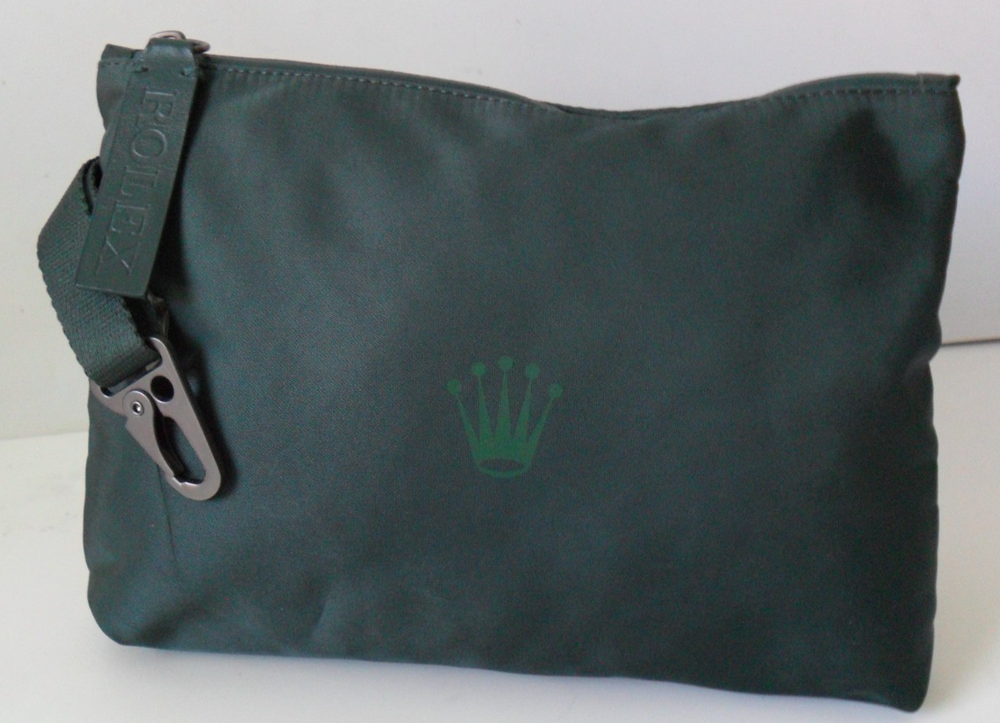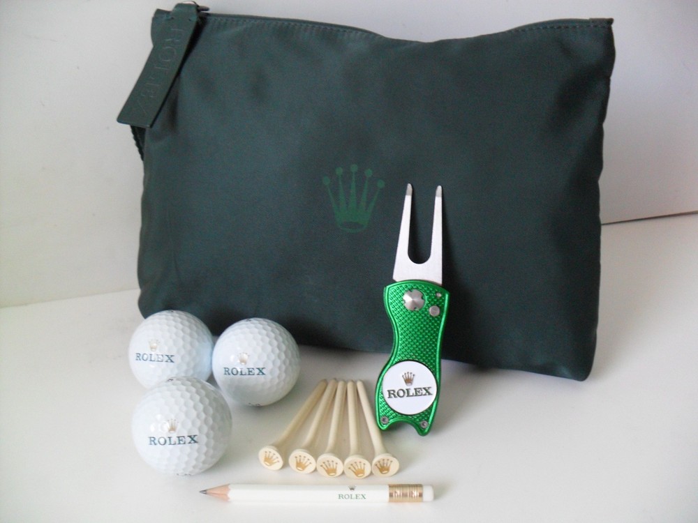 This is a Beautiful Rolex Accessories Pouch PLUS 3 Rolex Titleist Pro V1 Golf Balls, Rolex Divot Tool With Magnetic Ball Marker, 5 Rolex Gold Crown Golf Tees and Rolex Golf Scoring Pencil. Brand New - Entire Set Never Used - Excellent Condition The Iconic Rolex "Crown" Logo is Featured on the Front of the Pouch. The Block Letter "ROLEX" Logo is Embossed into the Leather Zipper Pull. Pouch is Made of Tear, Stain and Water Resistant Nylon/Polyester. Pouch Features Water Seal Zipper Closure. Pouch Features Gun Metal Stainless Steel Spring Bag Hook. Pouch Measures 10.25" X 8". Secure Zipper Slip Pocket Inside Pouch for Loose Accessories/Wallet. Set Includes: 3 Titleist Pro V1 Rolex Golf Balls. Set Includes: Rolex "Switchblade" Style Divot Tool With 1" Diameter Metal Magnetic Ball Marker Featuring the Rolex "Crown" and Block Letter "ROLEX" Logos. Set Includes: 5 Rolex Gold Crown Logo Golf Tees (2.75" Long) Set Includes: Rolex Golf Scoring Pencil. Non-Smoking Home.