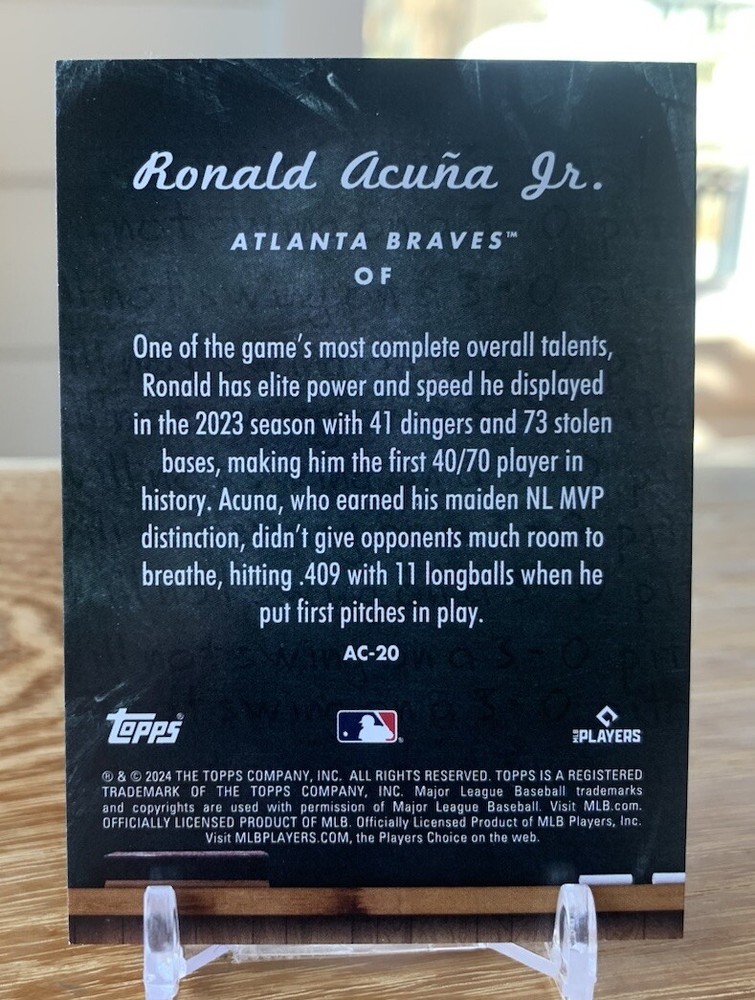 Print Run:600Type:Sports Trading CardFeatures:Insert, Parallel/Variety, Short Print, ExclusivePlayer/Athlete:Ronald Acuña Jr.Parallel/Variety:Bluegtin13:Does not applySet:2024 ToppsYear Manufactured:2024Team:Atlanta BravesCard Size:StandardLanguage:EnglishLeague:Major League (MLB)Original/Licensed Reprint:OriginalManufacturer:ToppsUPC:Does not applySeason:2024Vintage:NoCountry of Origin:United StatesSport:BaseballCard Number:AC-20