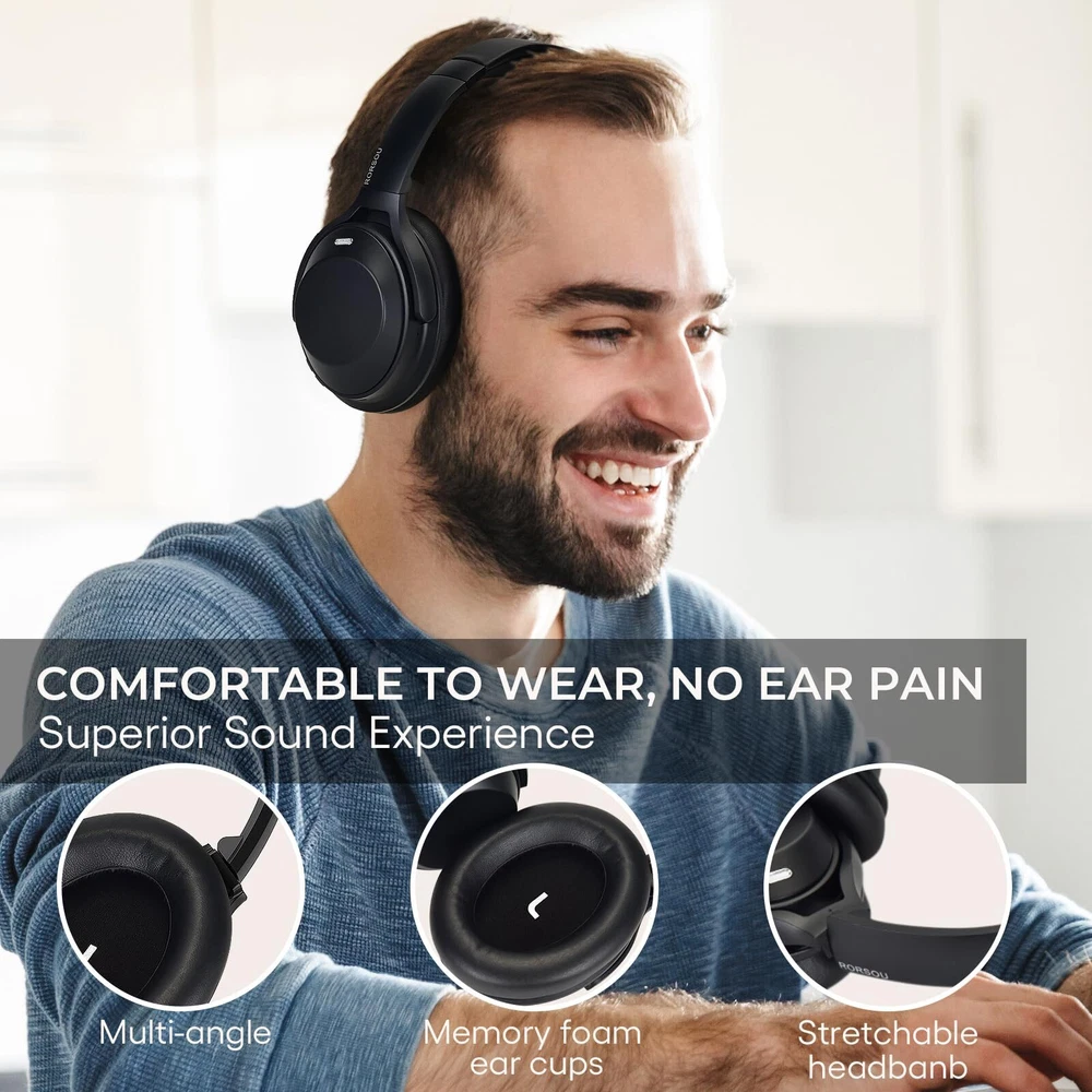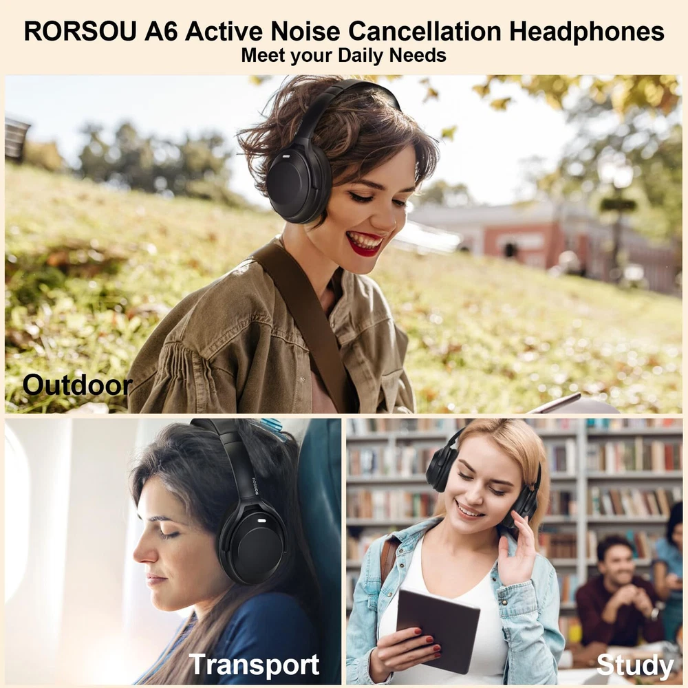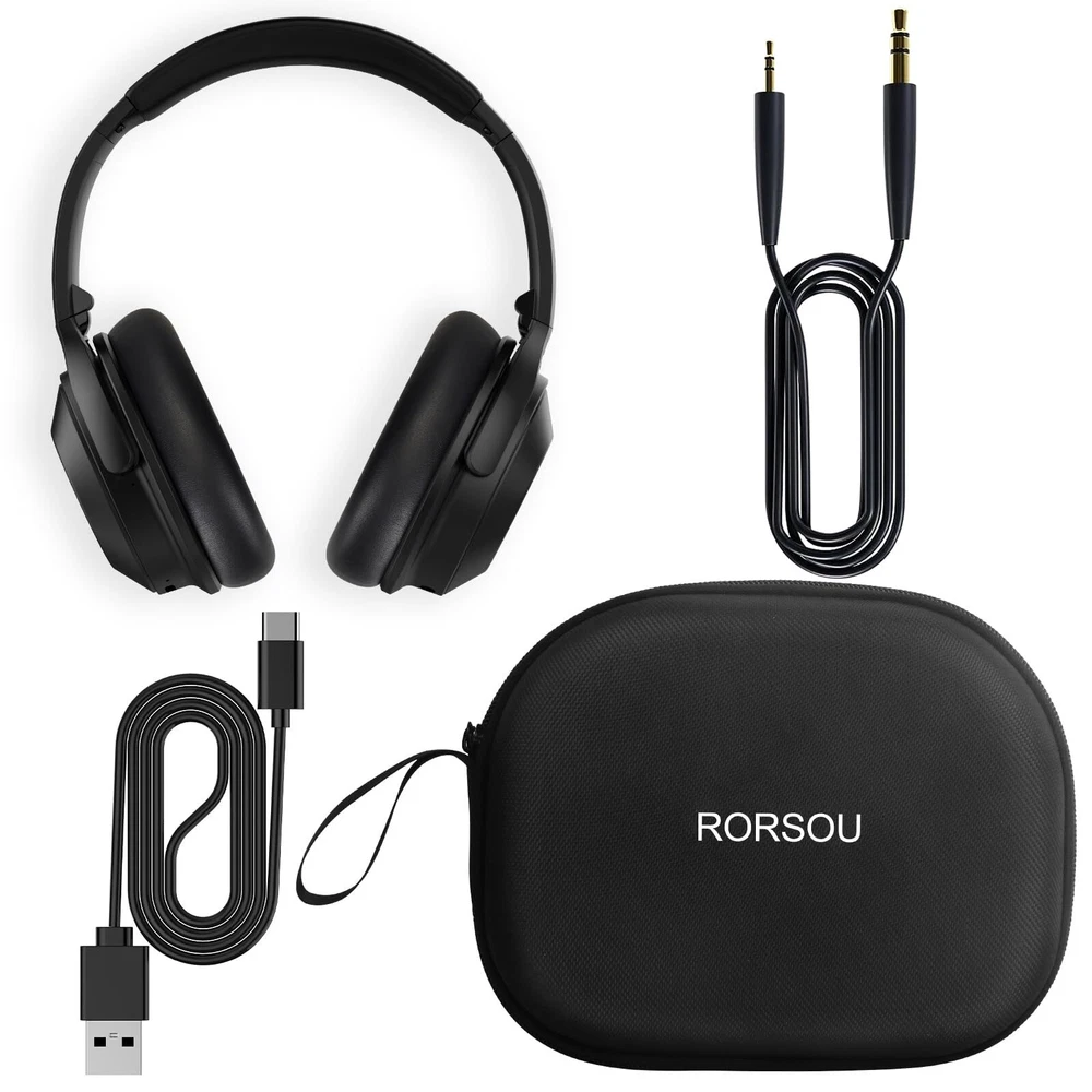 【Active Noise Cancelling Technology(ANC), Transparent Mode】: Industry-leading Active Noise Cancelling Headphones adopts the latest noise reduction technology, a combination of active noise reduction and passive noise reduction, which can detect and eliminate a wider range of low and intermediate frequency noise, such as car and aircraft engines and Busy office. "Transparent Mode" This feature lets in ambient noise, so you can easily hear announcements on an airplane or subway, or listen to what's happening around you without removing the active noise cancelling headphones. 【Premium sound quality, HiFi Stereo】: HiFi Stereo and clear treble benefits from the 40 mm audio driver and advanced Bluetooth 5.3 chip, which deliver exceptionally clear sound you can enjoy gorgeous deep bass feast. Just lose yourself in the music. 【Ergonomic Design】The professional-grade protein ear-pads, 100° swiveling ear cups, lightweight (only 0.31 lb), self-adjustable and flexible headband delivers a fatigue-free listening experience. The headphones fold compactly for easy storage when traveling. 【Up to 60 hours of playtime, Fast charging】:Enjoy up to 35 hours of music in noise cancelling mode, or extend the playtime to 60 hours in standard mode. A quick 5-minute charge gives you 4 hours of listening. You can charge it through the Type-C port, or use a 3.5mm audio cable for a wired connection. 【ANC headset , After Sale Protection】: Package includes ANC Noise Cancellation Bluetooth headphones,3.5mm backup audio cable, USB charging cable, User Manual and Travel protective storage bag. RORSOU dedicated to providing high quality products with excellent after-sale service. 180-days Hassle Free limited Protection and quick response customer Service. If you have any question, contact us and we'll get back to you within 12 hrs.