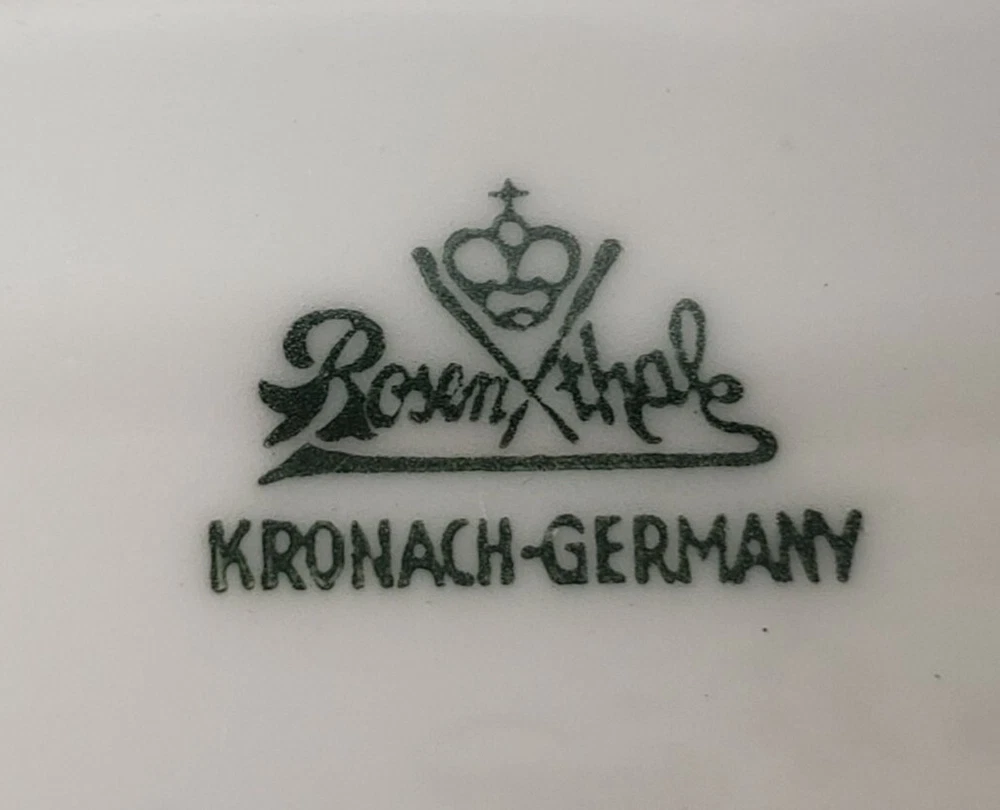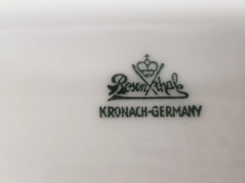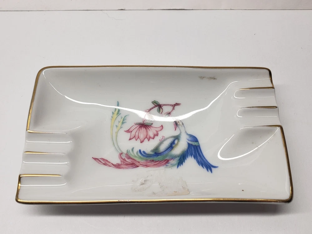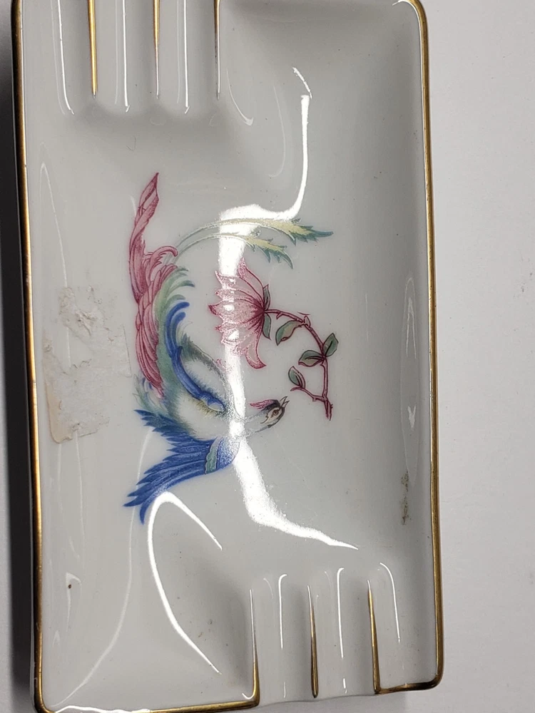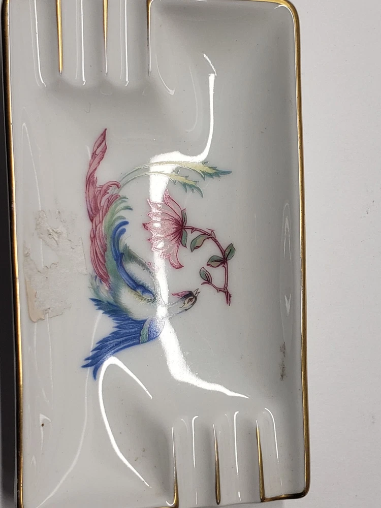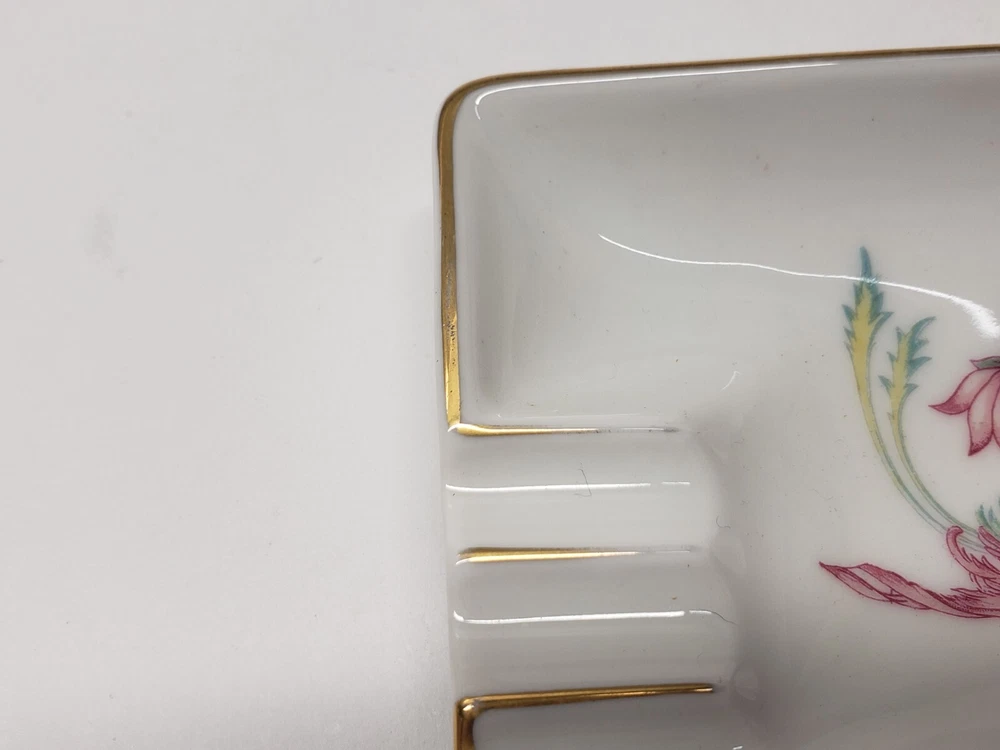 This Rosenthal porcelain ashtray is a beautiful piece featuring an ivory color with a gold rim, adorned with a floral and bird design. Its rectangle shape and vintage original production style make it a unique addition to any collection. The backstamp is printed and it was made in Germany, specifically in Kronach. The ashtray is perfect for those who appreciate fine porcelain and decorative pottery. It is a must-have item for collectors of Rosenthal brand pieces. Its history and origin make it a valuable item for those who appreciate the beauty of vintage and antique porcelain.