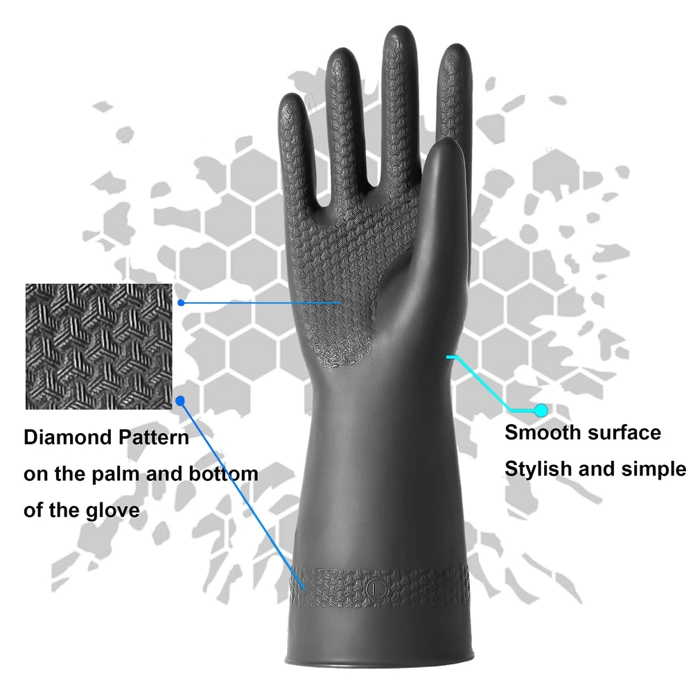 Size: Small 12" Medium 12.2'' Large 12.6'' X-Large 12.9'' SPECIFICATIONS - Size:Small,length 305mm/12",Width 95mm/3.75",Thickness 1.27mm/0.05". -Size:Meidum, length 310mm/12.2'',Width 110mm/4.3'',Thickness 1.27mm/0.05". - Size:Large,length 320mm/12.6",Width 115mm/4.53",Thickness 1.27mm/0.05". - Size:X-Large,length 330mm/12.9",Width 119mm/4.7",Thickness 1.27mm/0.05". -Material:High- grade Natural latex. -Color:Black. -Weight:(Small:80g)(Medium:90g)(Large:100g)(X-Large:110g). -Packing:1 pair glove in one Plastic bag. KEY FEATURES -Unique crimping design makes the sleeves firm and not easy to slide. MULTIPLE USES - Automotive:Protect hands when handling oily equipment. -Furniture Renovation:avoid direct contact between paint and hands to protect the skin of your hands. -Household Cleaning:A good helper for dishwashing, protect your hands from chemicals, and keep your hands dry and clean. -Yard Work:Protect your hands from injury and keep your hands clean. -Laboratory:resist acid, alkali, protect your hand when you use chemical. !!!ATTENTION: -In order to make the gloves more durable,please wash it with water after using and store it in a ventilated place after airing. -Cannot used to stab and cut. -Can not touch high temperatures, can not be burned with fire. Rubber has the advantages of elasticity, wear resistance, cold resistance, and air leakage Diamond pattern increases friction and has a better grip. It is flexible to handle small things and not easy to slip off when grasping objects. Our gloves can protect your hand from the corrosion of alkalis, alcohols, acetone. ect. No bad smell on your hand after using! Easy to take off after touching water. MULTIPLE USES- Ideal for chemical experiments, machinery manufacturing, farms, gardening, construction, automobile industry, gardens, yards, bathrooms, swimming pools, etc.