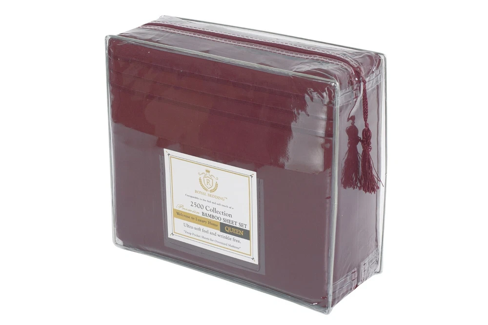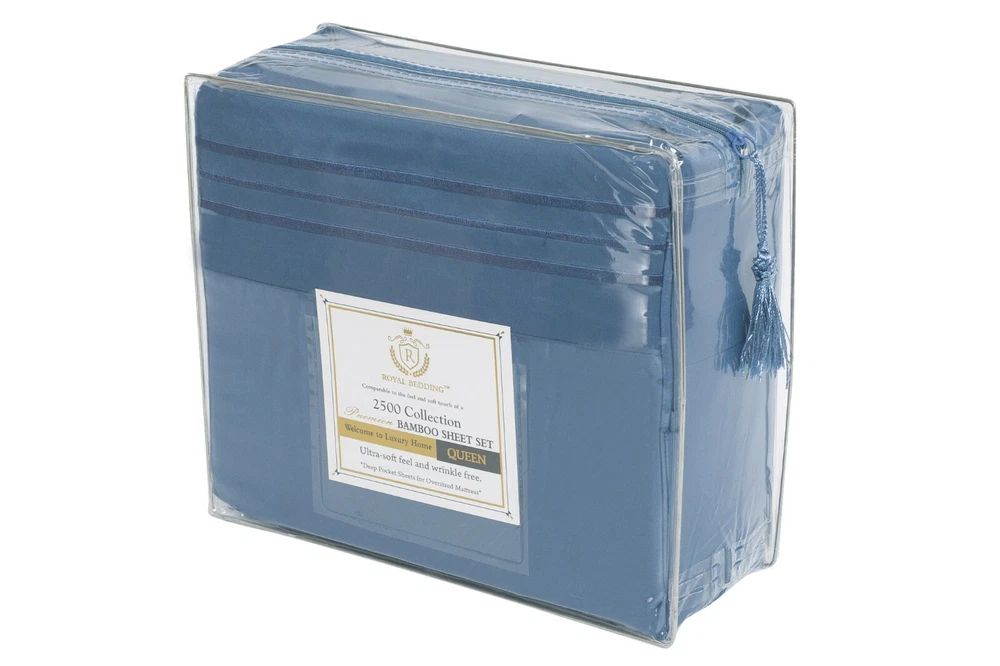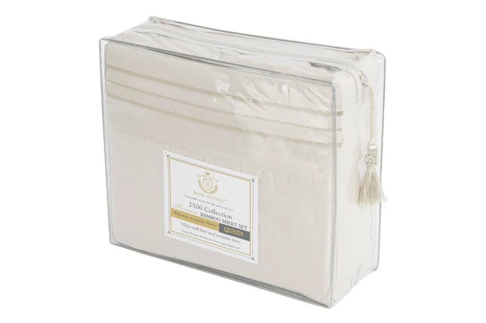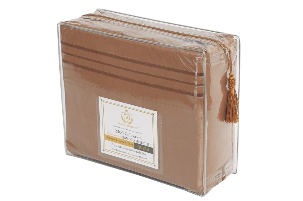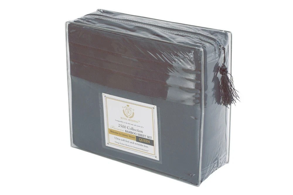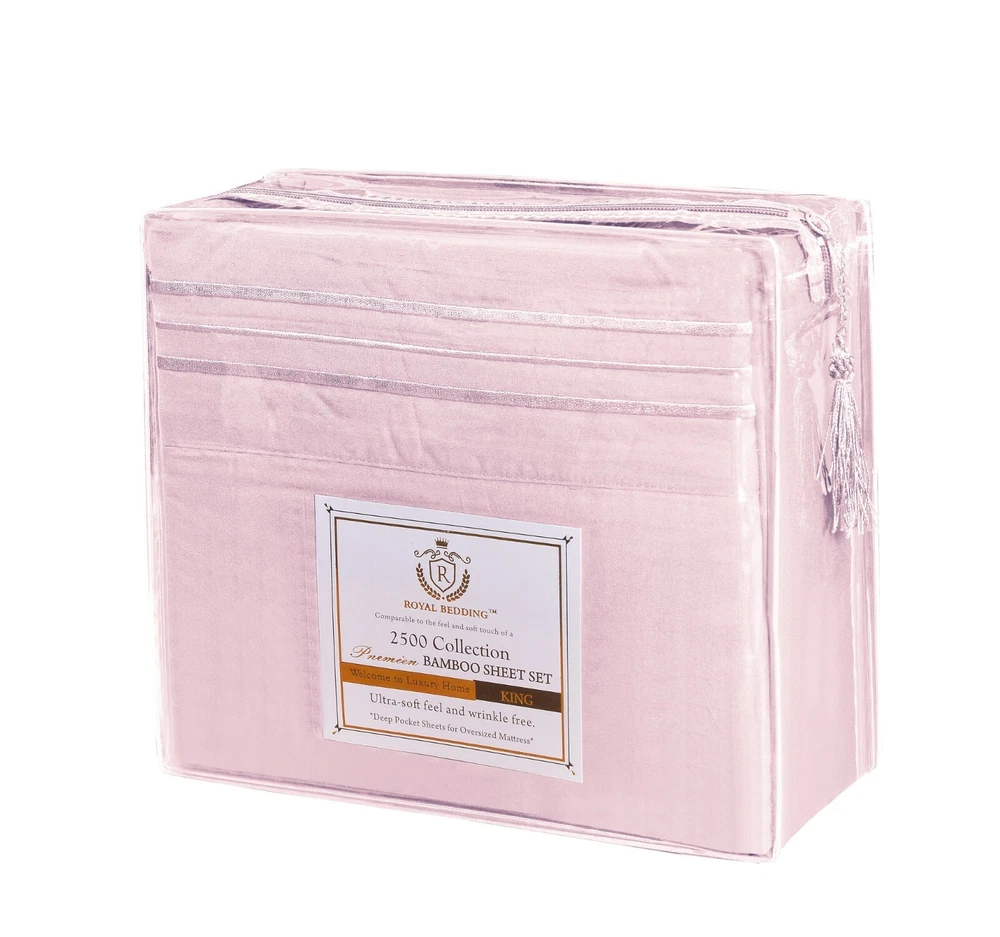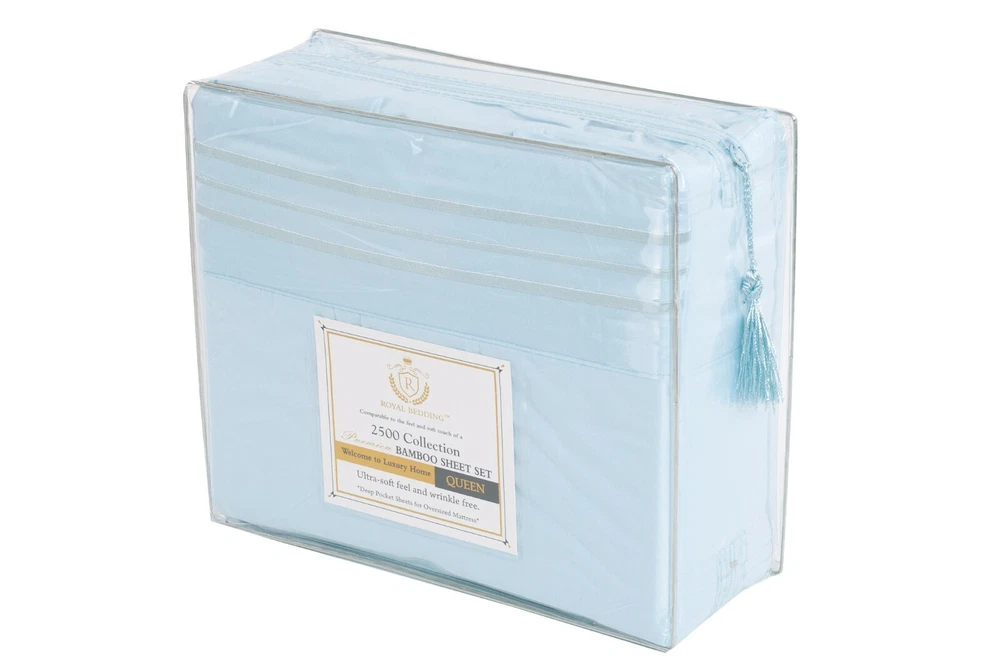 Royal Bedding Bamboo Collection Welcome to the Luxury! Our exclusive bedding will bring comfort and tranquility to your sleep. Sheet are made out of highest quality 100% double brushed, durable, high density threads, microfiber. Deep pockets with fully elasticized fitted sheet guarantee a snug fit for mattresses up to 16" deep. Easy care, wrinkle free, non-iron, fade resistant. Machine wash in cold with like colors. Dry on low heat. Sizes Available: · Twin XL: 66" X 102" Flat Sheet, 39" X 80" Fitted Sheet And One 20"X 30" Pillowcase. (3 Pc Set) · Full (Double): 81" X 96" Flat Sheet, 54" X 75" Fitted Sheet And Two 20" X 30" Pillowcases · Queen : 90" X 102" Flat Sheet, 60" X 80" Fitted Sheet And Two 20" X 30" Pillowcases. · King : 102" X 105" Flat Sheet, 78" X 80" Fitted Sheet And Two 20"X 40" Pillowcases · California King : 108" X 102" Flat Sheet, 72" X 84" Fitted Sheet And Two 20" X 40" Pillowcases Split King: 108" X 102" Flat Sheet, 39" X 80" 2 Fitted Sheets, 2 Pillowcases 20" X 40" (5Pc Set)