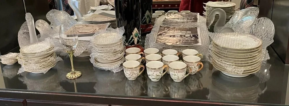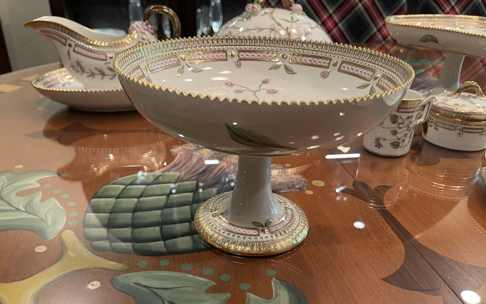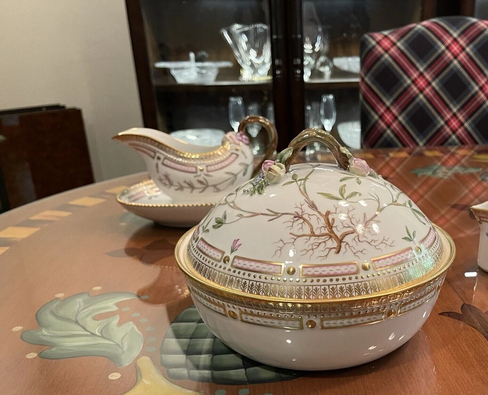 One of our good friends asked us to sell this beautiful Royal Copenhagen porcelain dinner set with Flora Danica pattern. The set is service for 12 including service pieces. Here is a list of what is included: 12 Dinner plates,12 salad plates, 12 bread plates, 12 butter plates, 12 soup bowls, 12 tea cups with saucers, 1 creamer, 1 sugar bowl. There is also, which is included, a covered tureen, 1 standing triangular plate, 1 round fruit plate, a 14.5 inch oval platter and one 18.5 inch oval platter. The Flora Danica design has just celebrated its 232 anniversary. Flora Danica is one of the world's most prestigious and luxurious porcelain collections. They still carefully make all there porcelain by hand. If you have any questions, please contact us and we will be glad to answer them for you. Settlement must be within 3 days after the end of this listing. Please contact us prior to purchase for payment and shipping information.