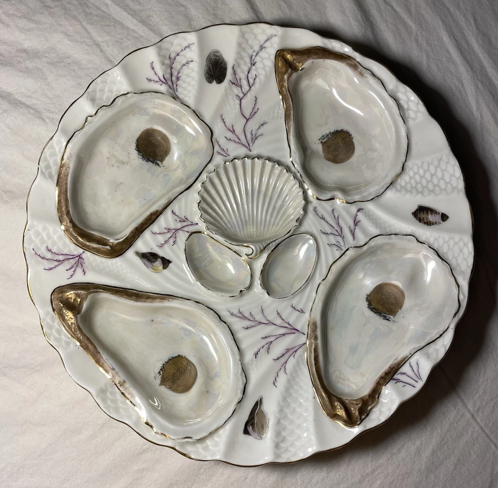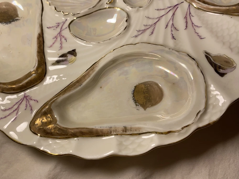 What I have up for auction is a royal Vienna oyster plate it is white and gold with purple running through it a reef scene, there are 4 wells and the back is marked 703/xL7 REGISTIRT. I believe This plate is 19th century. Dimensions: 8 1/4th wide 8 3/8ths long and a inch inch and 1/4th tall Condition: No cracks chips or any flaws it is in good used condition PLEASE LOOK AT PICTURES FOR FURTHER DETAIL SOLD AS IS